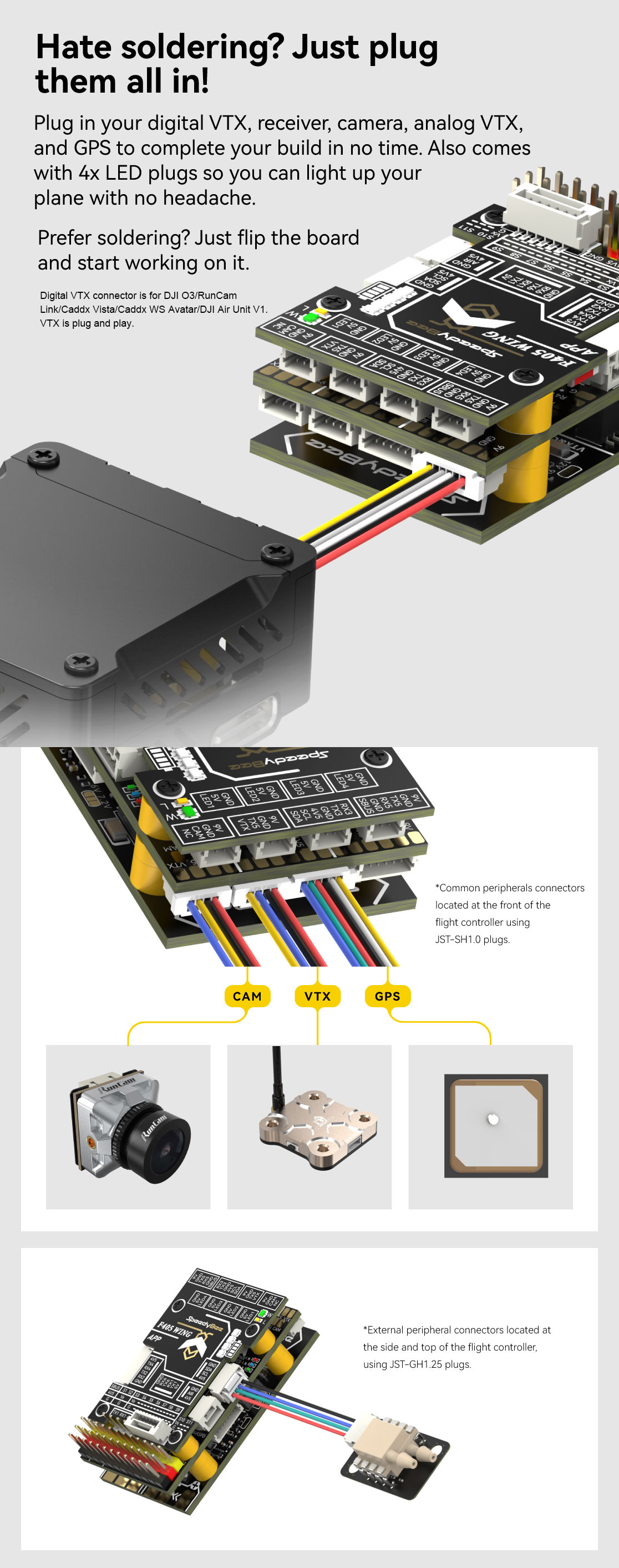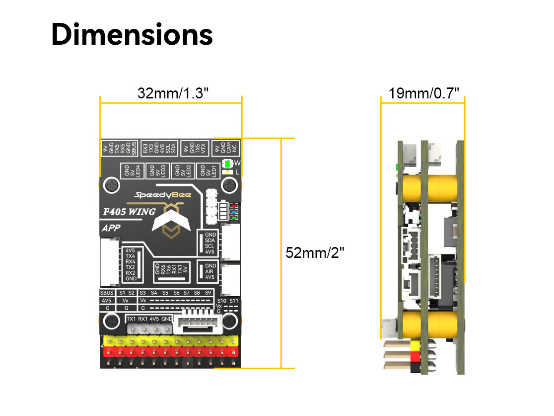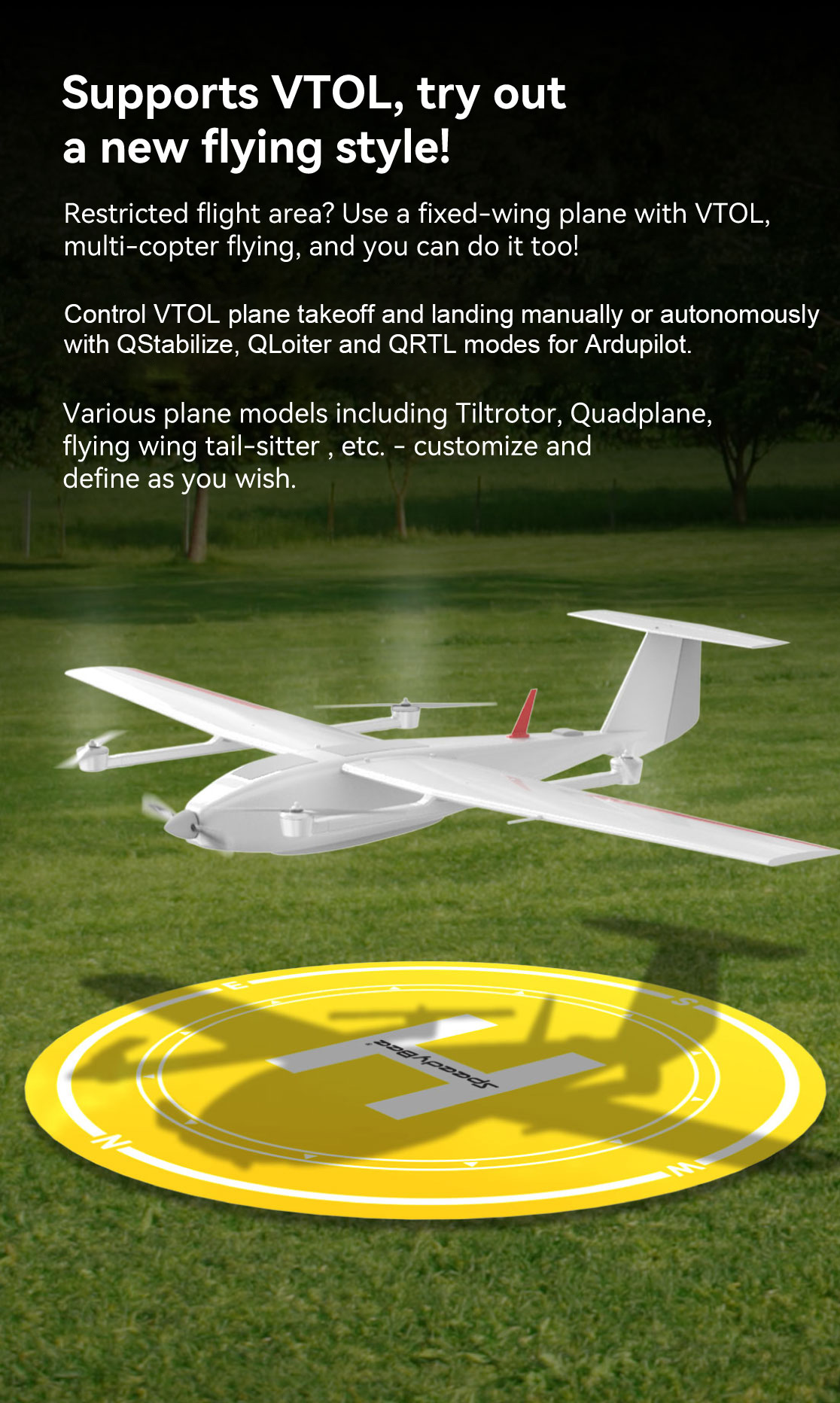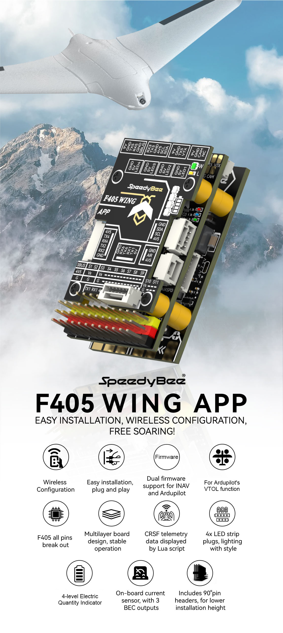 - Supported FC Firmware: for INAV: SpeedyBeeF405WING(default) and for ArduPilot: SpeedyBeeF405WING