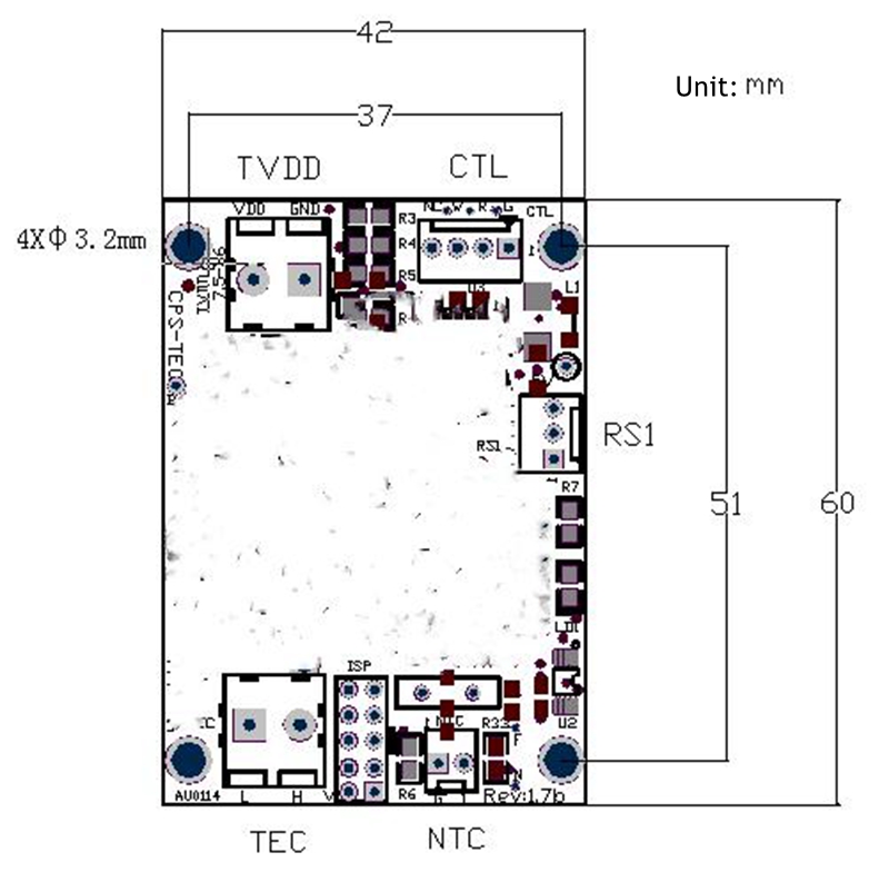 - Power supply voltage: 5V - 24V (Recommend standard voltages such as 5/7.5/12/15/24. The rated voltage of the TEC should be equal to or slightly higher than the supply voltage. If the rated voltage of the TEC is lower than the voltage, it is also acceptable to set the output ratio.)