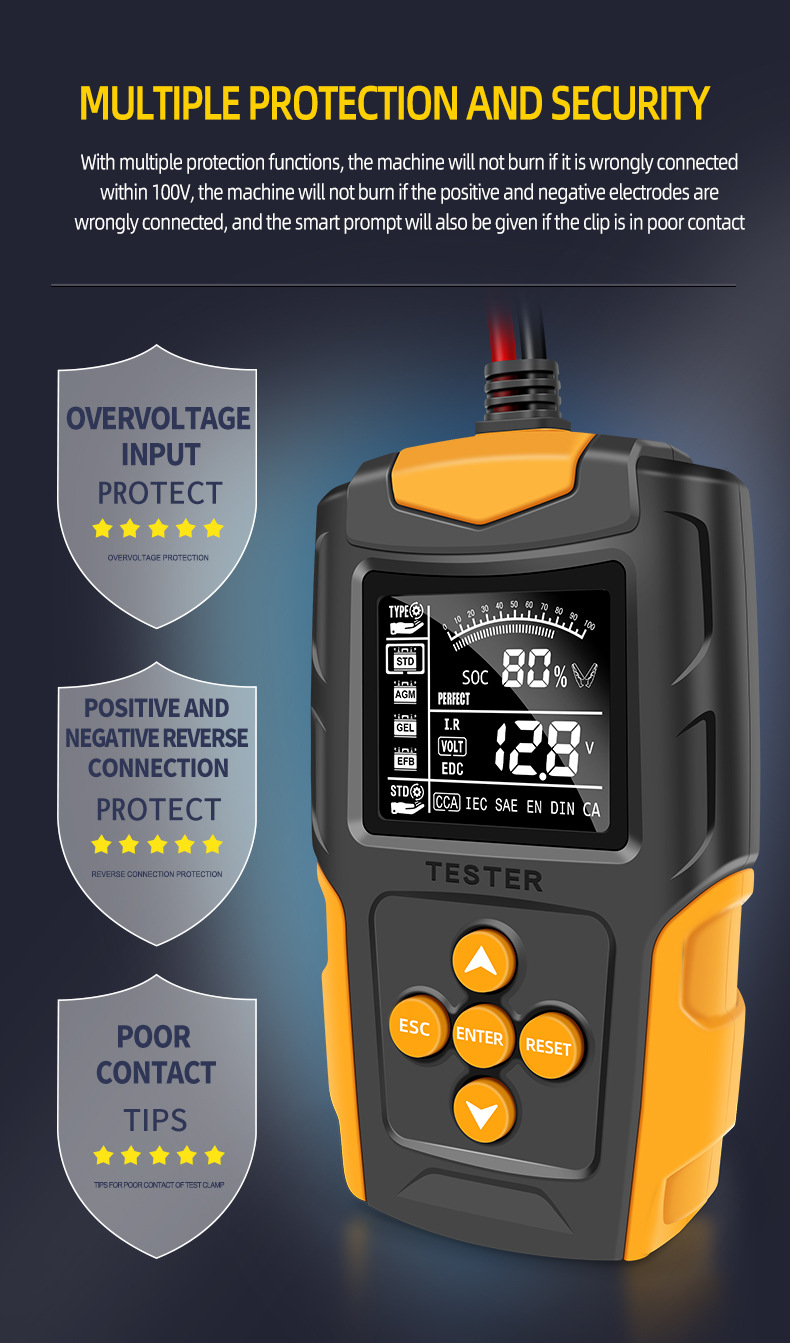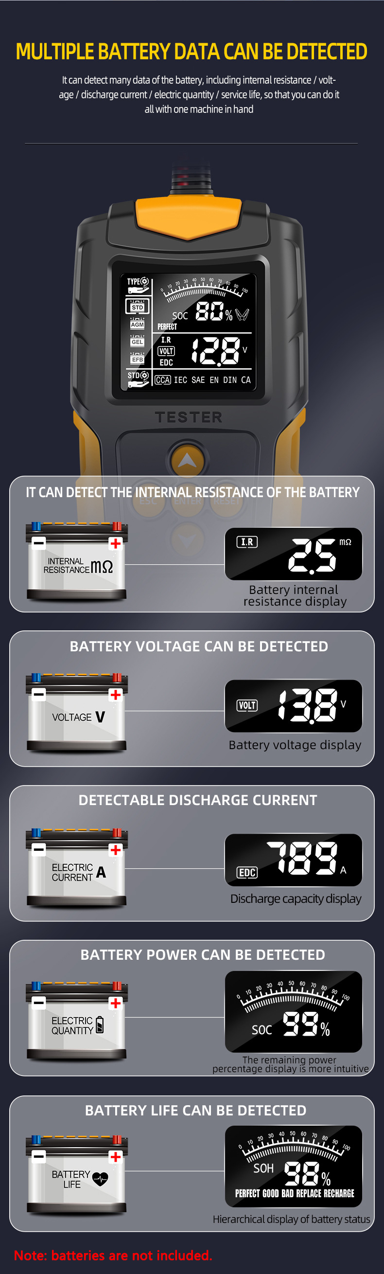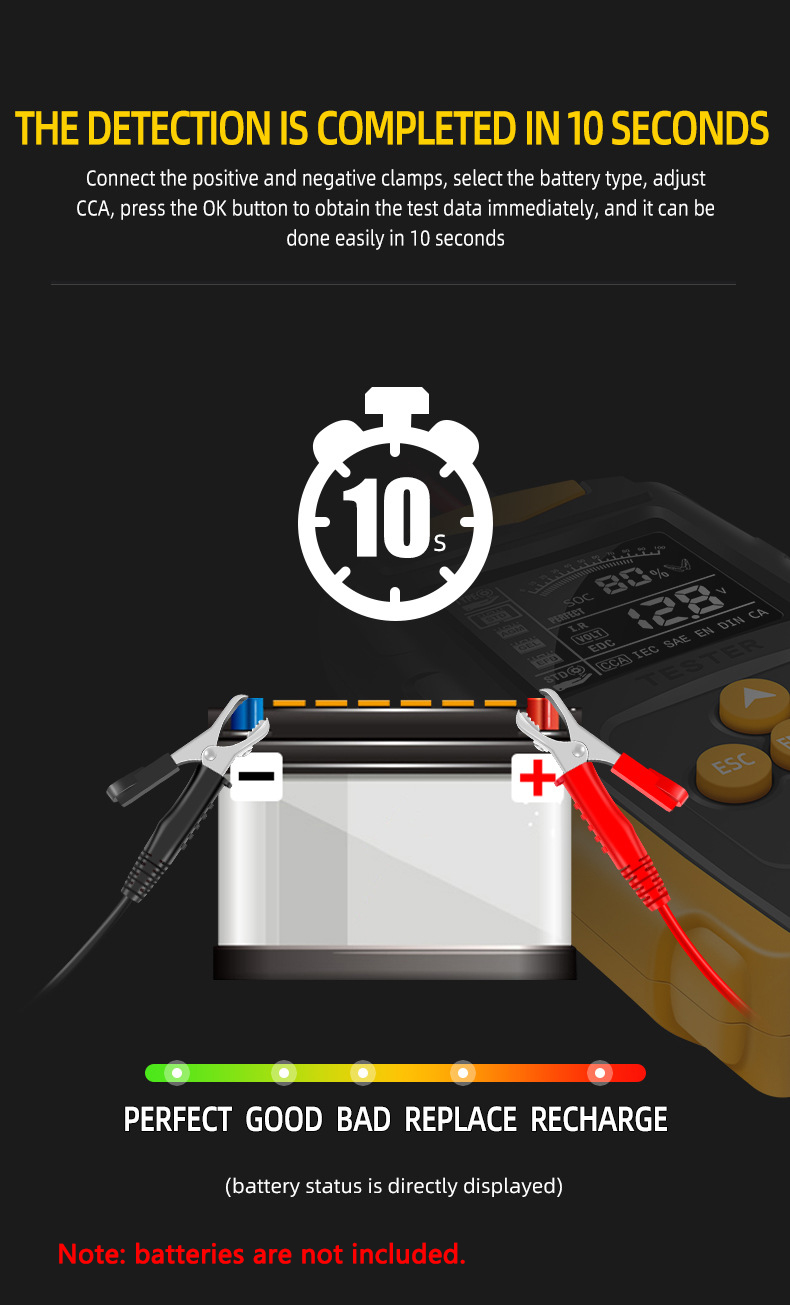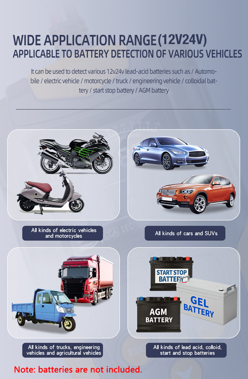 - Test capacity range: 3-200AH detection of various 12V 24V lead-acid batteries such as automobile batteries, electric vehicles, motorcycles, trucks, engineering vehicles, colloidal batteries, start stop batteries and AGM batteries