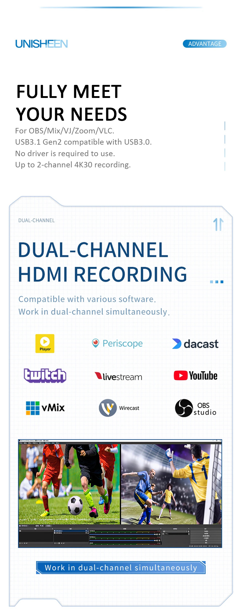 * Compatible software: For VJ, OBS, Zoom, vMix, QuickTime, Microsoft Teams, Skype, Google Hangouts, GoToMeeting, Potplayer, VLC, Wirecast, AMCAP, etc.