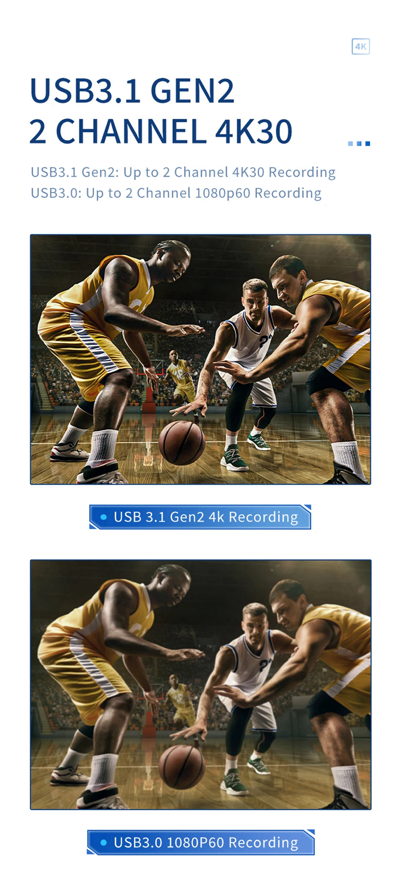 * USB3.1 Gen2: Up to 2-channel 4K30 recording