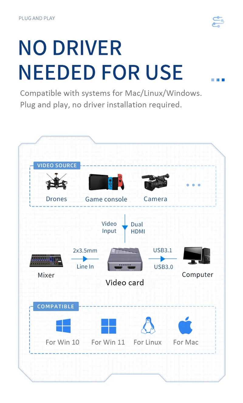 UC3300H-Pus is perfectly to compatible with the system for MacOS! It can input dual 4K30 at same time for Mac System! It is also working well on system for Linux, Win10 and Win11.