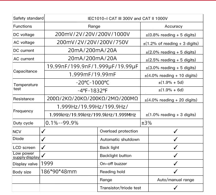 - Current, voltage, capacitance, resistance, frequency test. Temperature test. Zero line and live line test. Triode, diode and NCV test