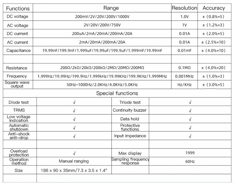 - DC/AC voltage, AC/DC current, data hold, diode, triode, square wave output, continuity buzzer, and temperature test