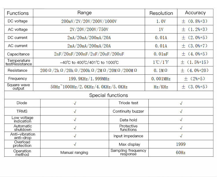 - DC/AC voltage, AC/DC current, data hold, diode, triode, square wave output, continuity buzzer, temperature test, and frequency