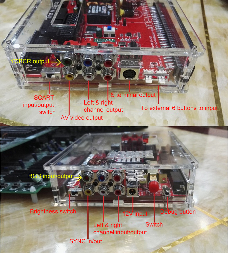 3. CBOX can be used as a video conversion box. It can be used in home machines such as for SS and PS, connected to the RCA head RGBS or SCART interface input on the CBOX to convert the color difference and S terminal output, featuring good effect! Instructions for use: Press the MODE switch to switch to the conversion box, and when the switch is up, it is in arcade mode. Remember not to do the opposite, otherwise there will be no picture!