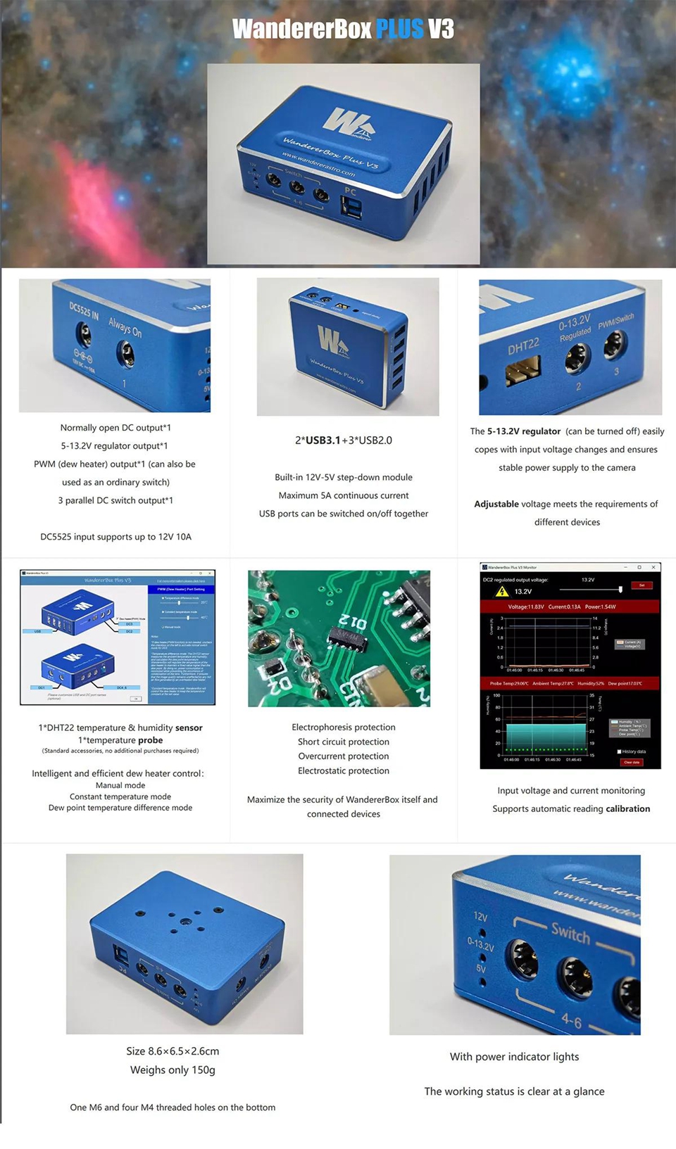 WandererBox Plus V3 Third Generation Astronomical Power Management Box +Mini Dovetail Module Support Input V/A Detection