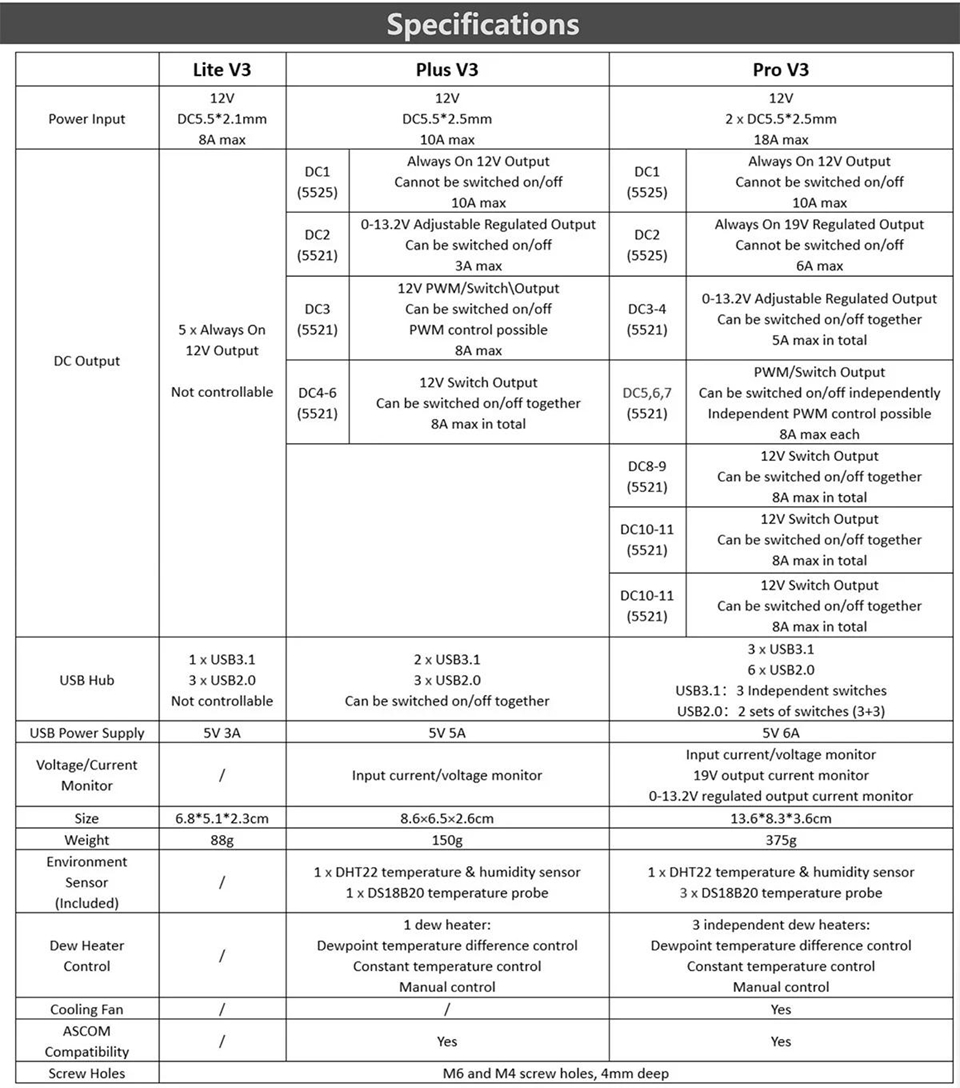 - Normally open DC output x 1; 5 - 13.2V regulator output; PWM (dew heater) output x 1 (can also be used as an ordinary switch); 3 parallel DC switch output x 1; DC5525 input supports up to 12V 10A