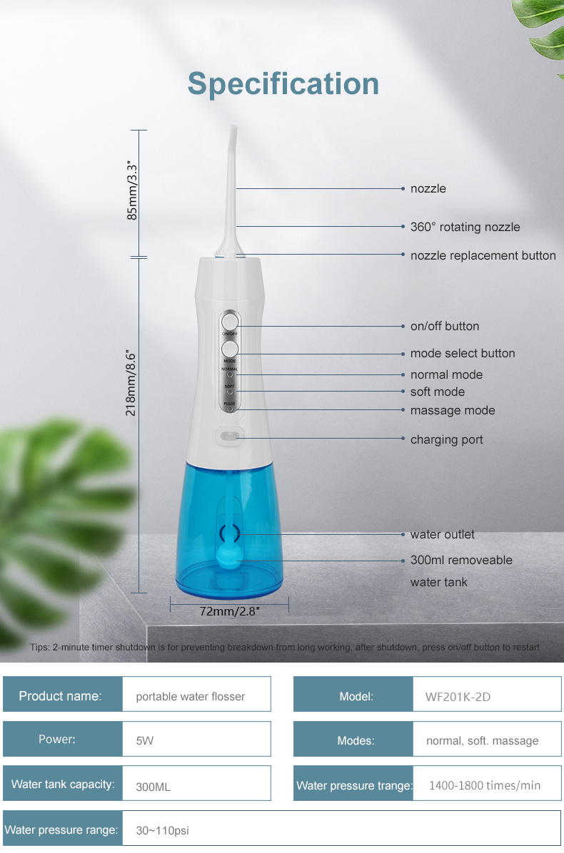 WF201K-2D 300ML Rechargeable Water Flosser Cordless Oral Irrigator Portable Water Flosser 3 Modes