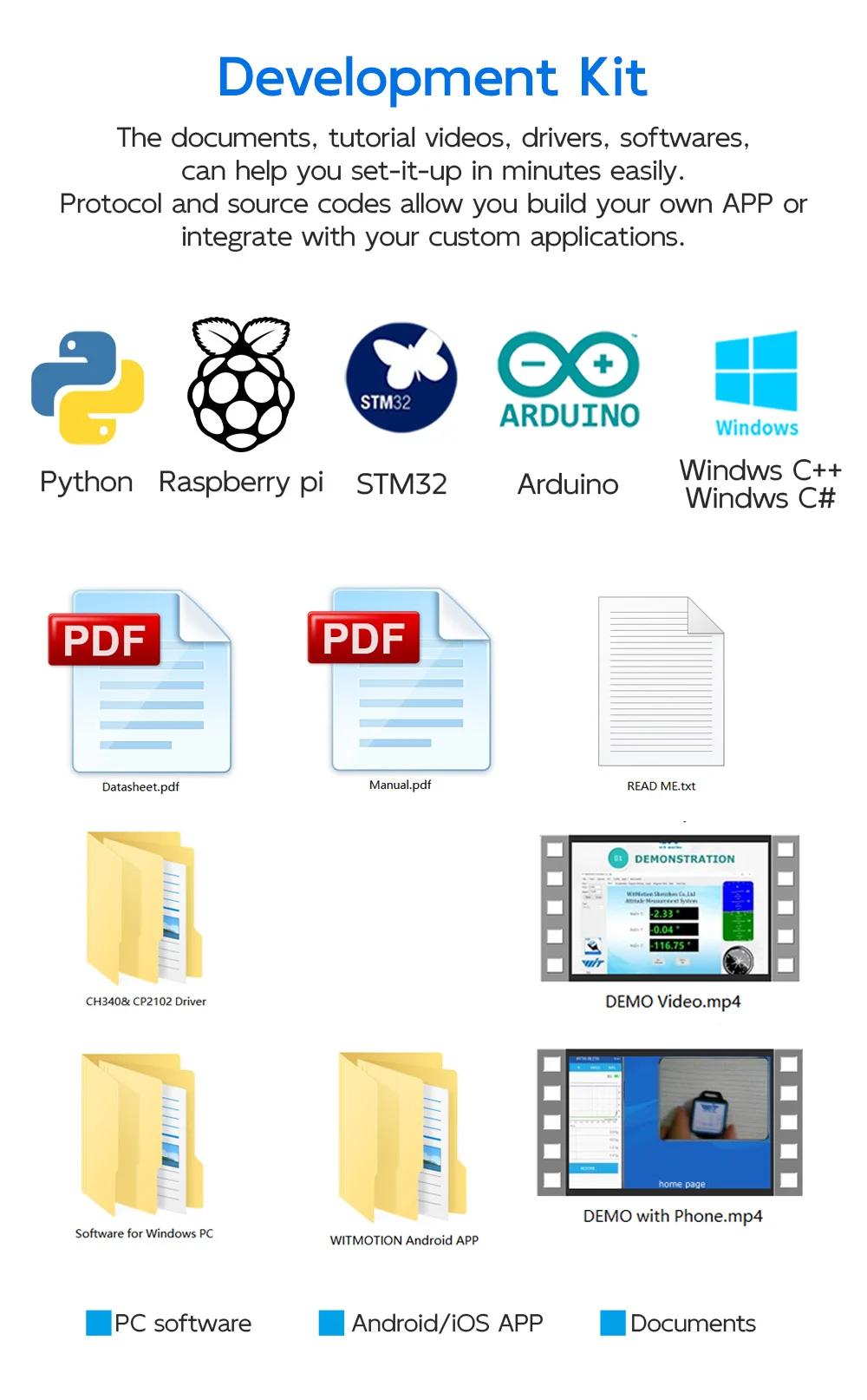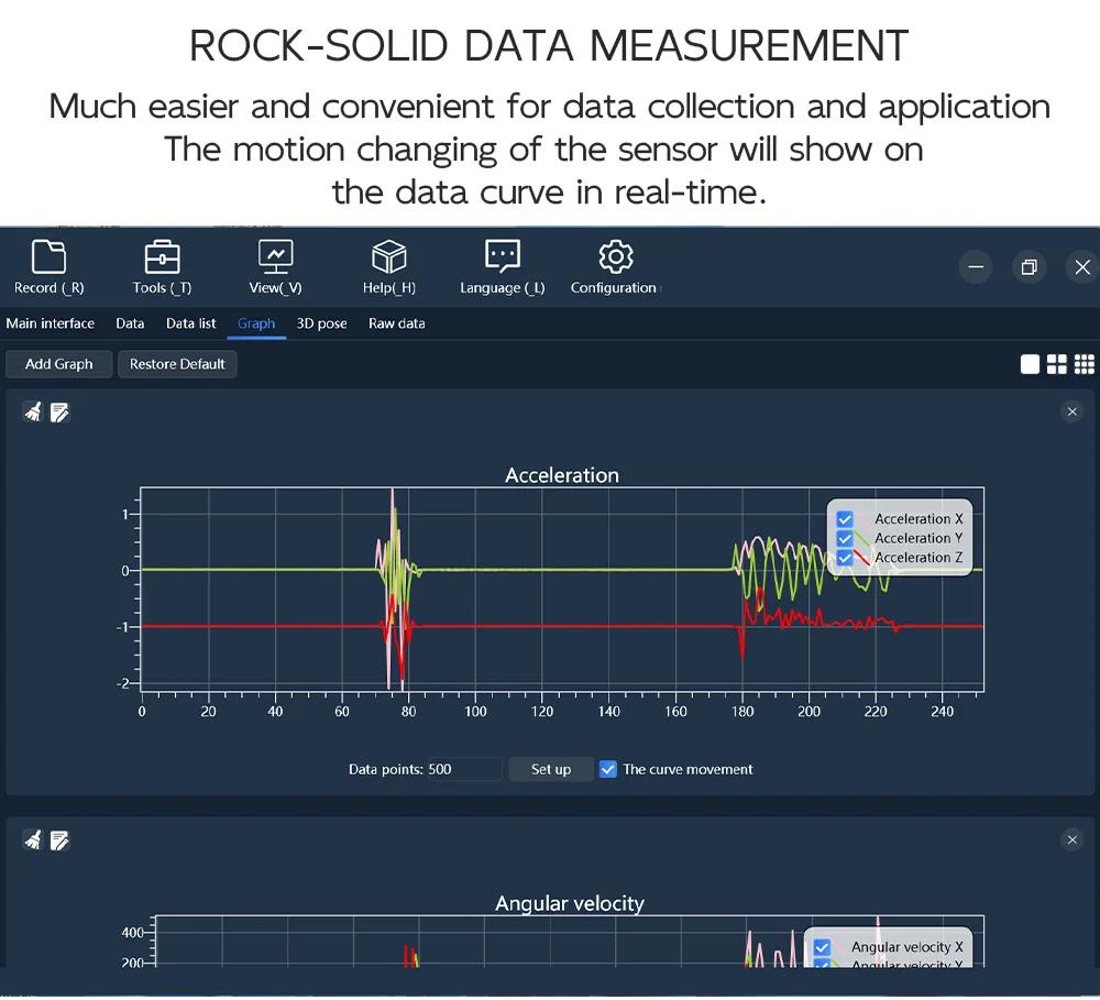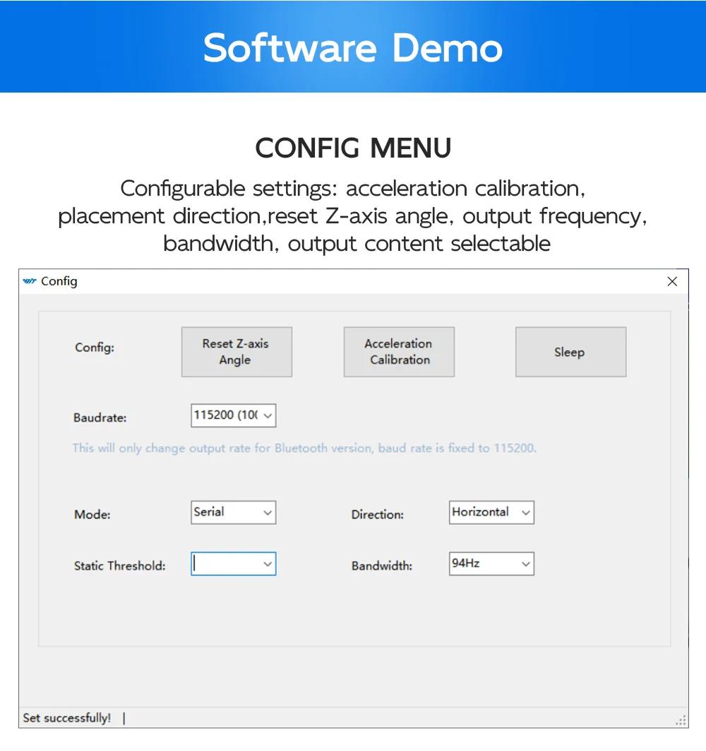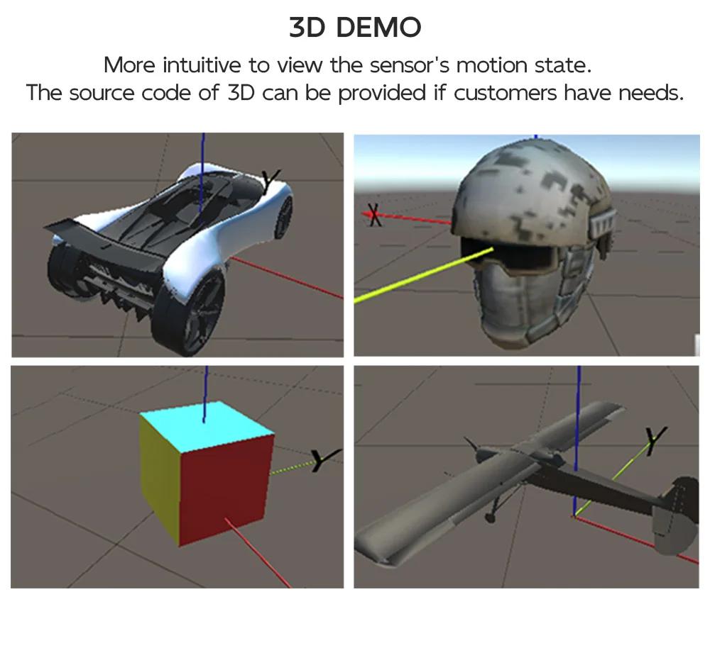 - Output: 3-axis acc + gyro + angle + mag + quaternion