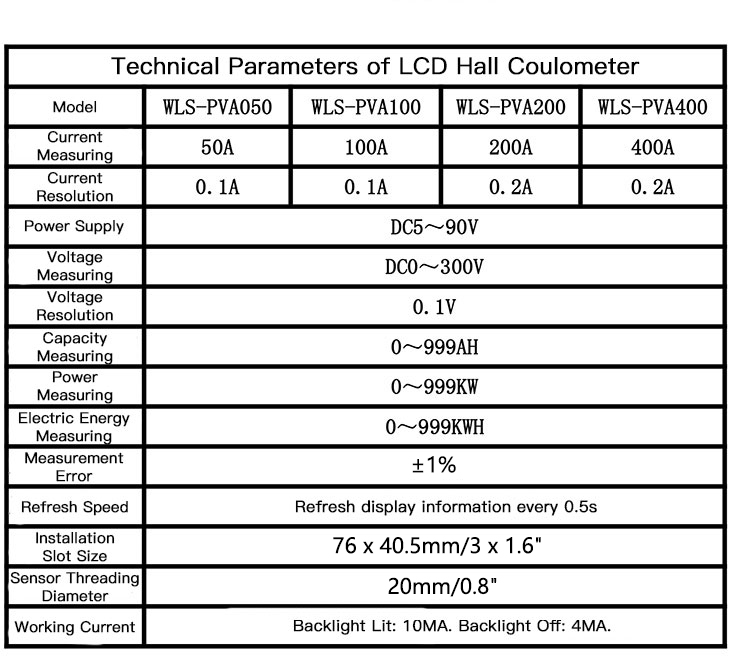 WLS-PVA200 Bluetooth 200A STN LCD Hall Coulomb Meter Voltage Current Meter Power Electricity Tester
