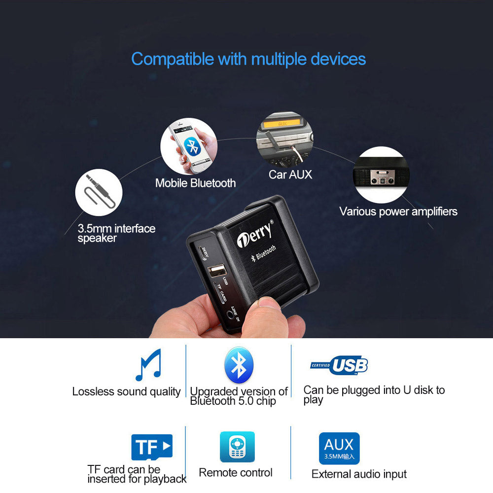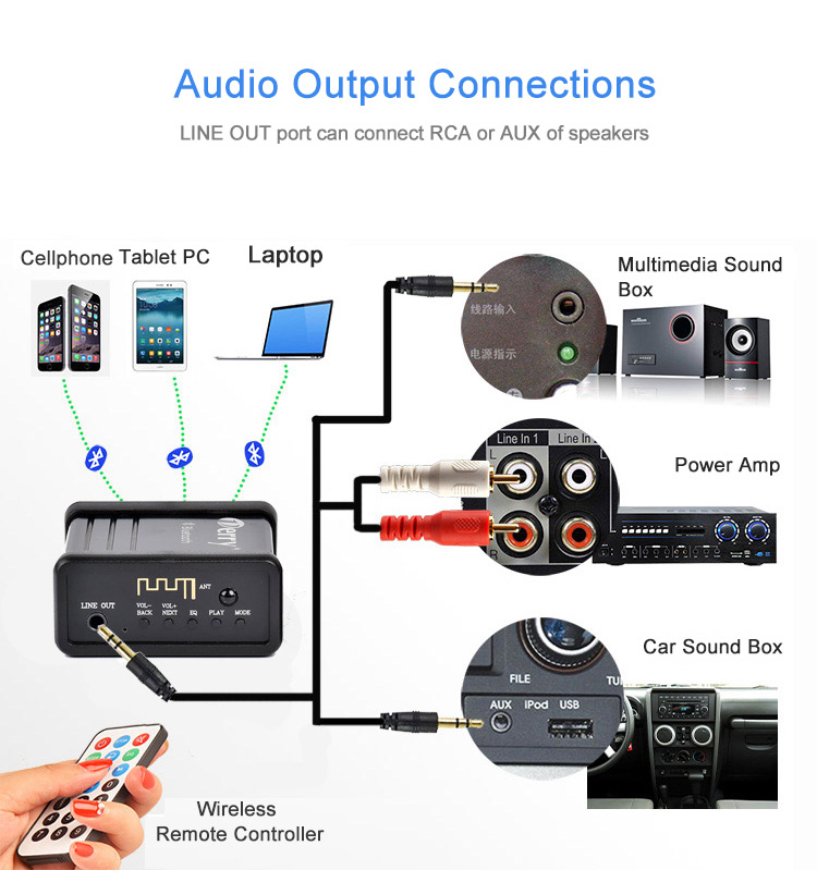- Compatible with cellphone Bluetooth, 3.5mm sound box, AUX audio interface car sound box, conventional power amp, etc.