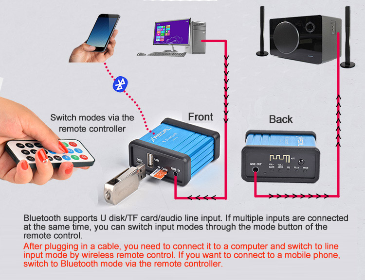 - Premium components: For USB U disk playing. For TF card playing. For AUX audio input. Imported filter. IR remote control receiver. Solid state audio capacitors. Upgraded Bluetooth 5.0 chip. With LINE OUT audio output port.