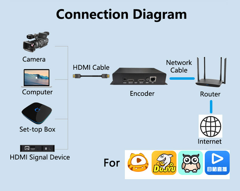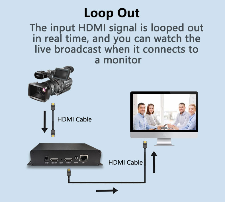 - HDMI loop-out encoder supports 1080P60 HDMI video signal input loop out