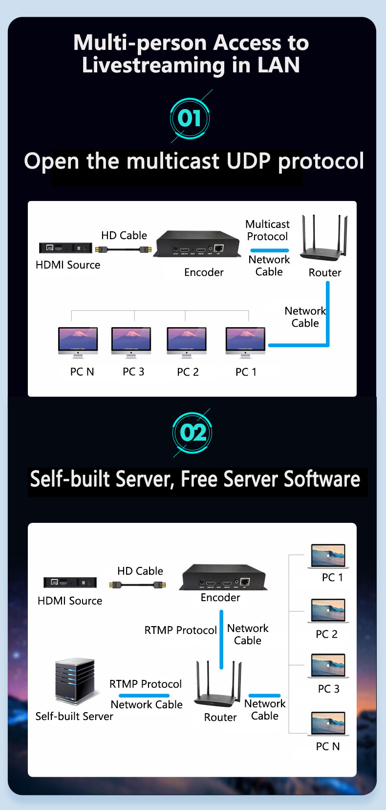 - The method for multiple people on the LAN to access the live broadcast: Open the multicast UDP protocol. Self-built server, free to provide server software