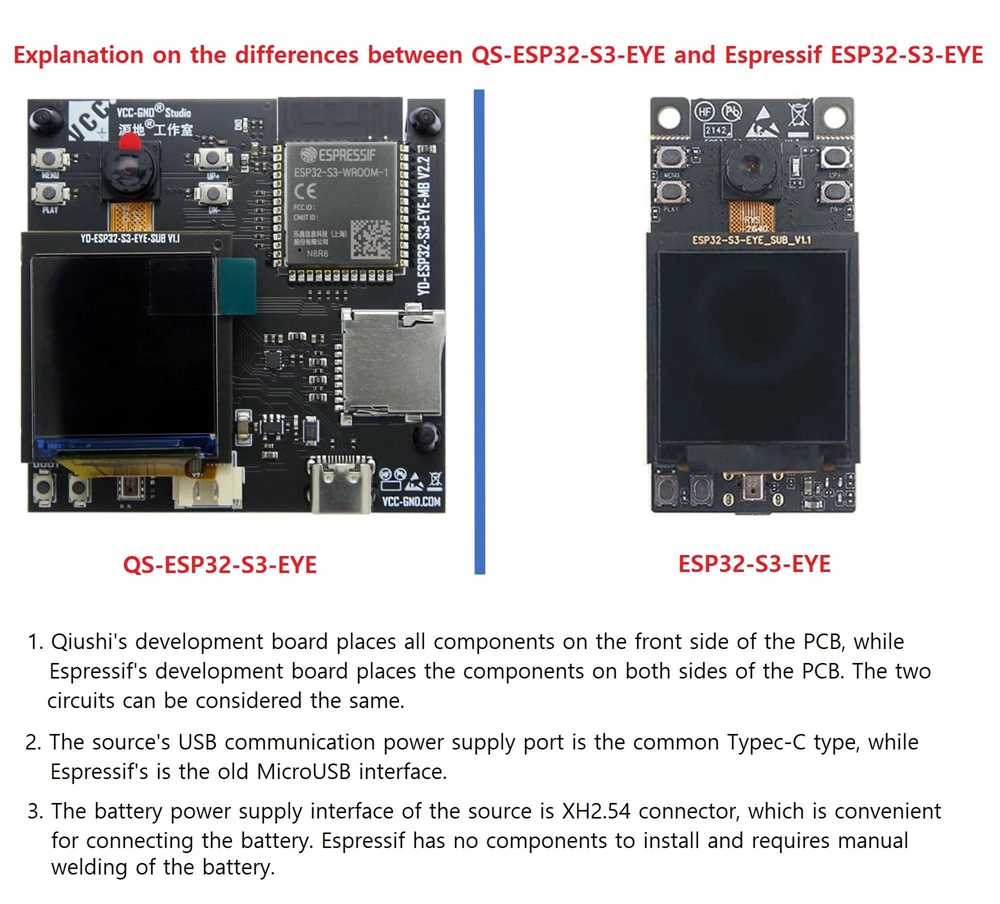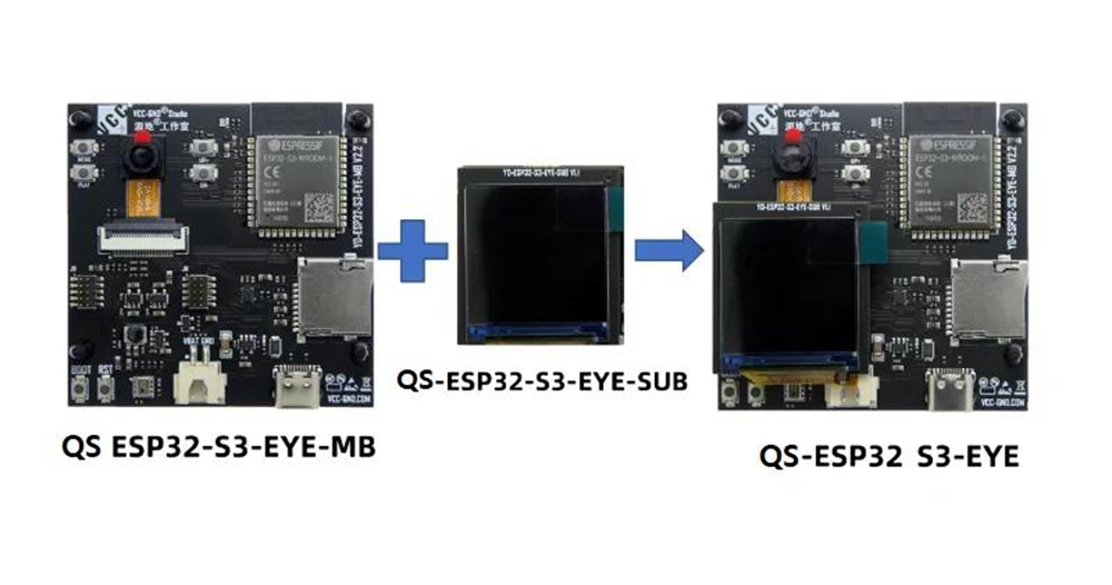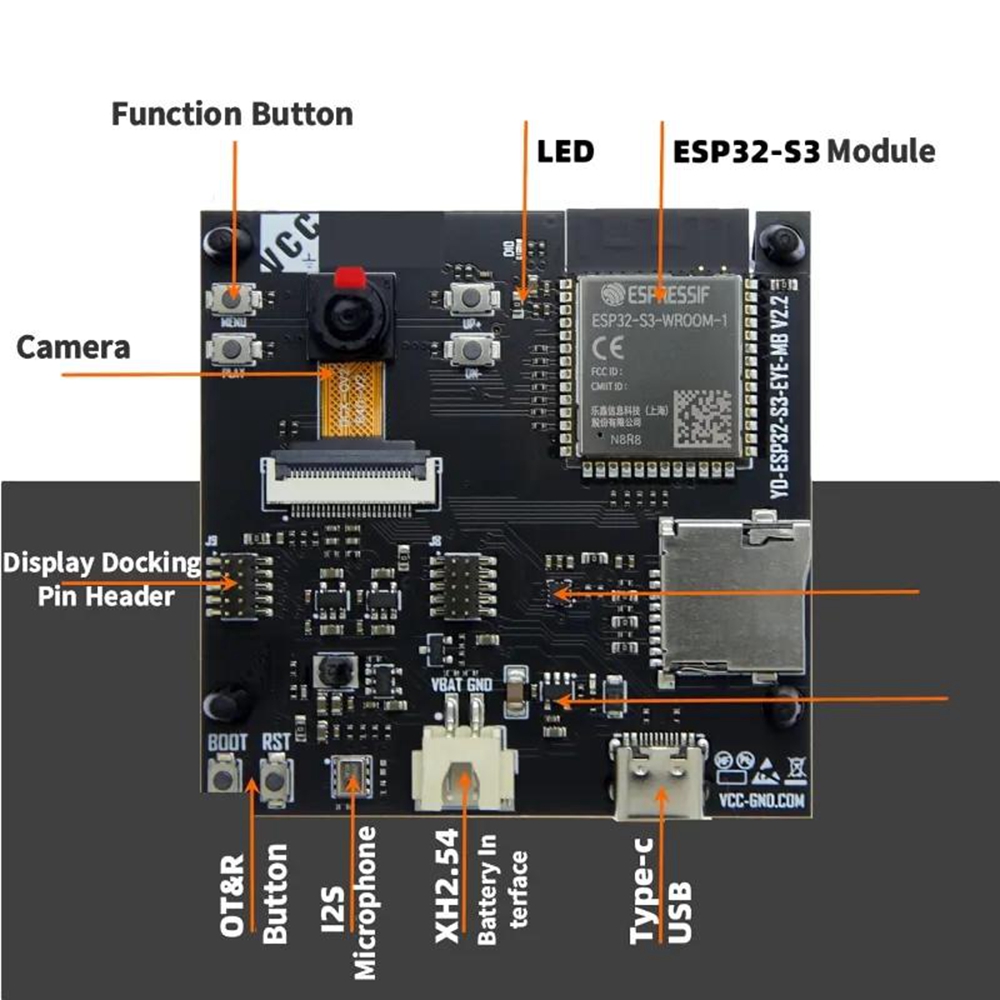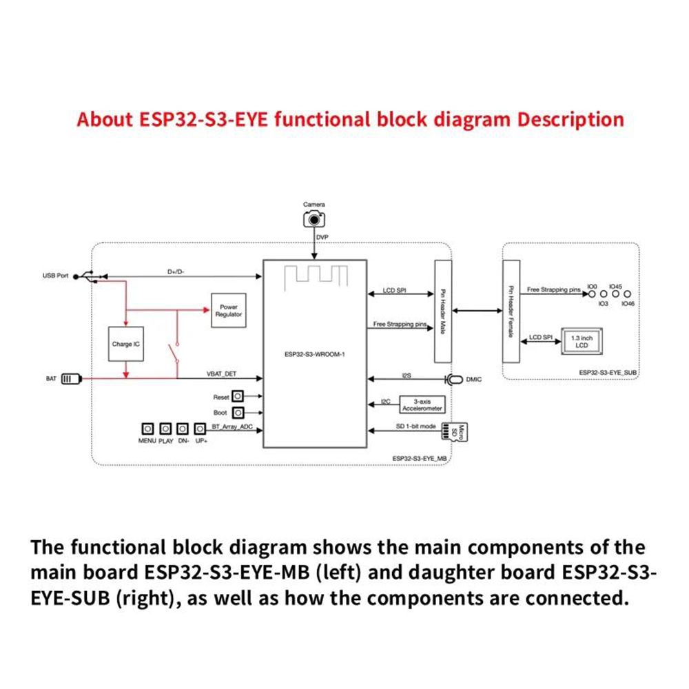 - The ESP32-S3-EYE development board consists of two parts: the main board ESP32-S3-EYE-MB, equipped with the ESP32-S3-WROOM-1 module, camera, SD card slot, digital microphone, USB interface and function buttons, etc.; the daughter board ESP32-S3-EYE-SUB, configure LCD display, etc. The main board and daughter board are connected by pin headers.