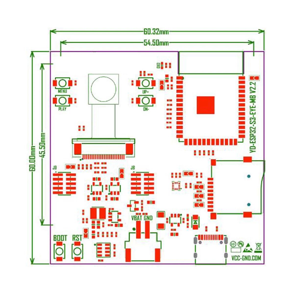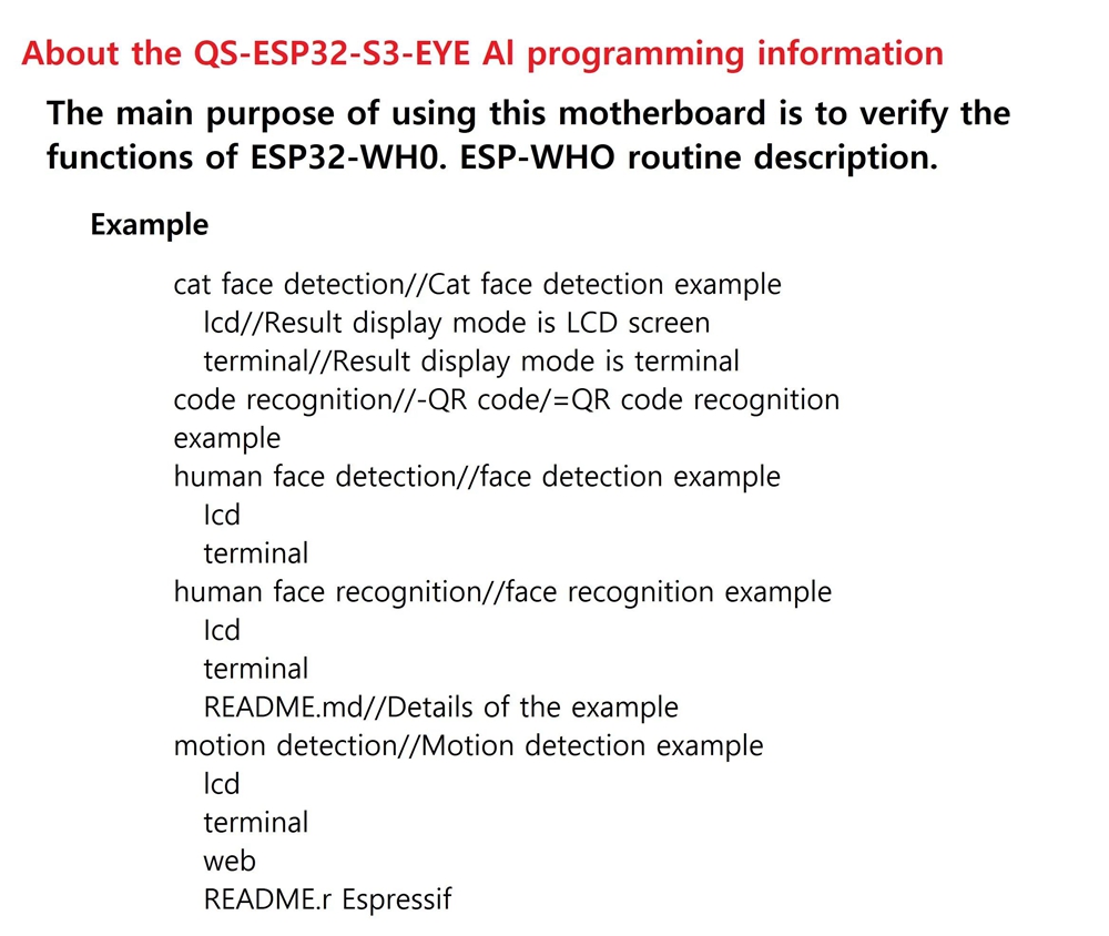 - ESP32-S3-EYE is a small AI (artificial intelligence) development board equipped with ESP32-S3 module and for Espressif AI development framework ESP-WHO. For Espressif's ESP32-S3-EYE development board can be equipped with a 2-megapixel camera, an LCD display, and a microphone for applications such as image recognition and audio processing. The board is also equipped with 8MB eight-line PSRAM and 8MB flash, with ample storage space. In addition, the ESP32-S3 chip also provides functions such as WiFi image transmission and USB port debugging for the development board. You can use ESP-WHO to develop various AloT (Artificial Intelligence Internet of Things) applications, such as smart doorbells, surveillance systems, face recognition punch-in machines, etc.