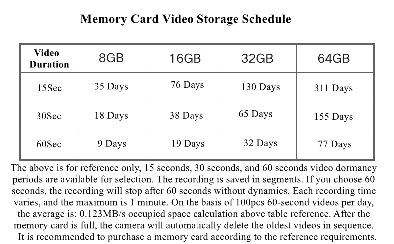 - Storage capacity: 32G card can store about 64 days (can store about 9000 videos, take 30 seconds to start shooting each time, and start 100 times a day). After the storage is full, it will be overwritten from the earliest shooting day
