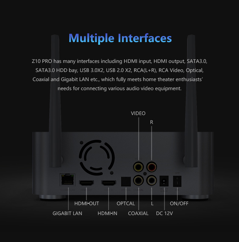- Interfaces: SATA 3.0 X2, USB 3.0 X2, USB 2.0 X2, HDMI-compatible output and input, OPTICAL, COAXIAL, VIDEO, LEFT and RIGHT, RS232 X1, Gigabit LAN