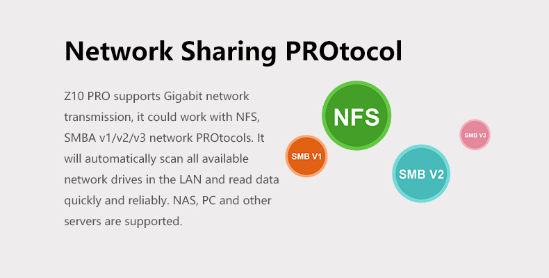 - Network protocols: NFS, SMB V1 / V2 / V3, DLNA