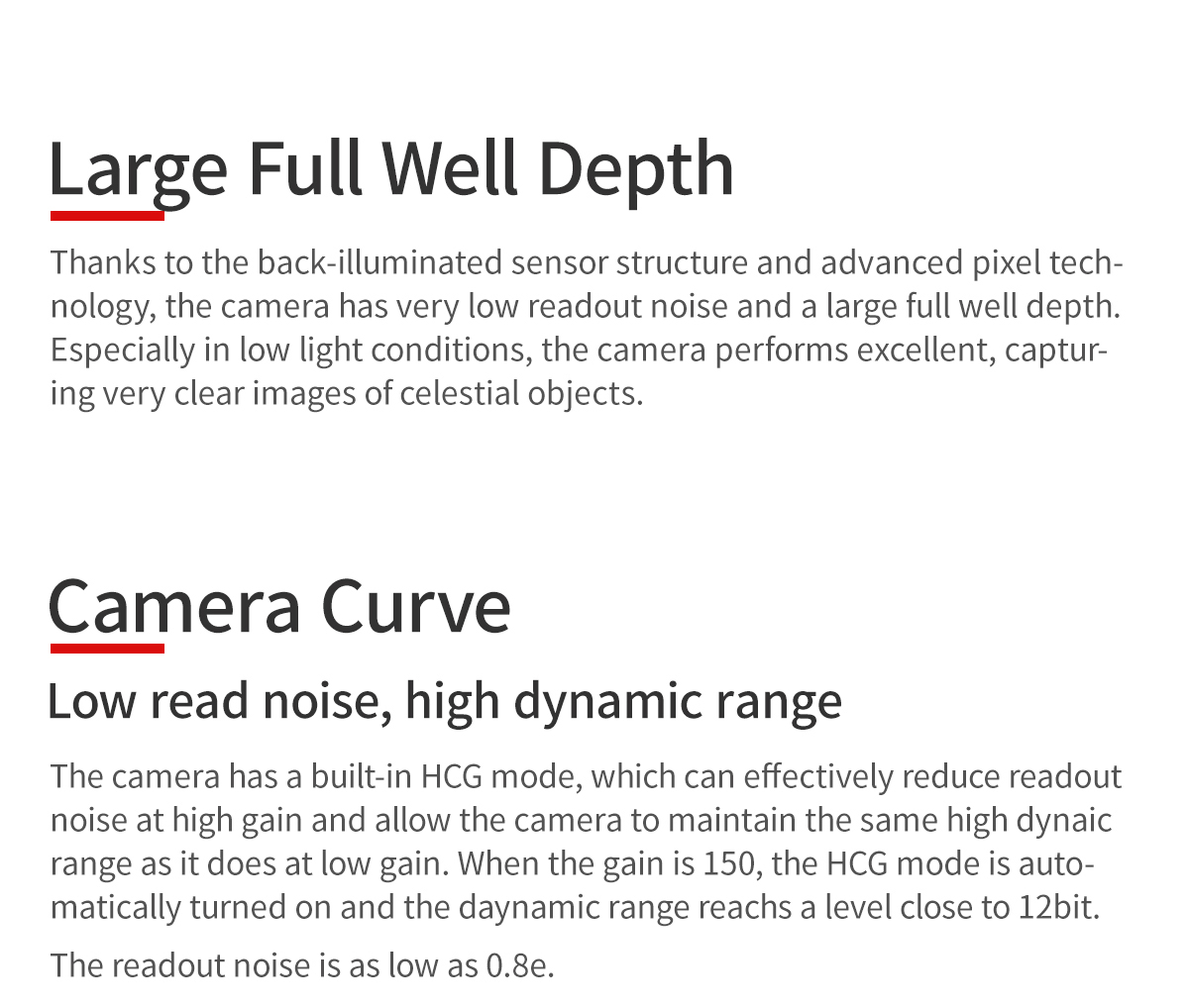 - Readout Noise: 0.8-12e (2.4e at 15db gain)