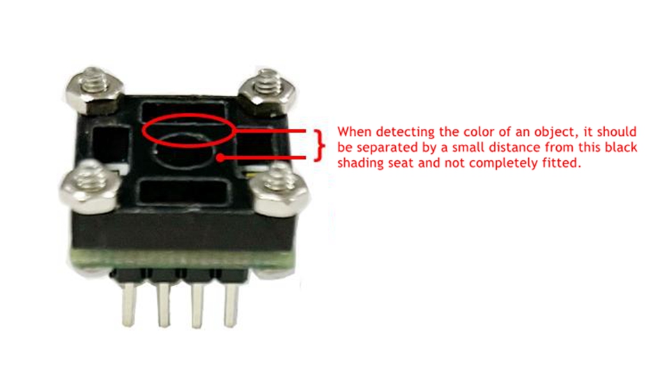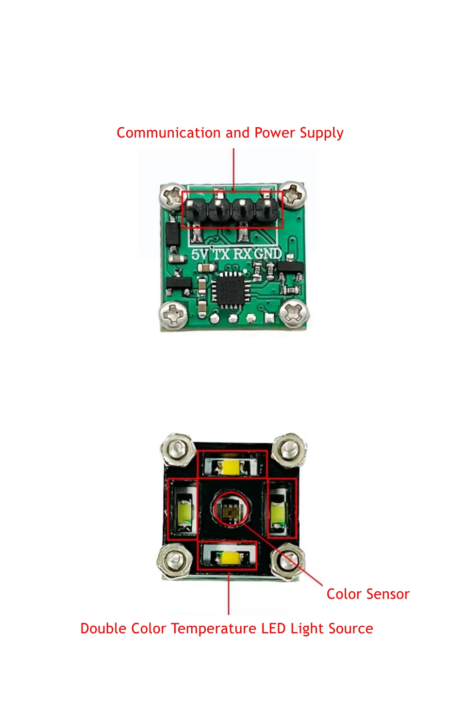 - Adjustable baud rate for serial communication, and dual color temperature LED light source on board. Its working principle is that the onboard LED emits light, and when it shines on the object being tested, the reflected light is detected and recognized by the sensor to identify the color.