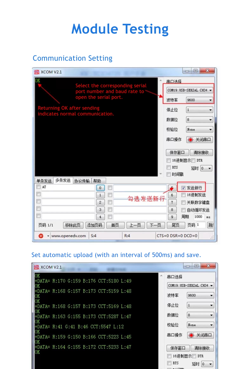 - Module features: color, color temperature, illuminance detection, adjustable baud rate, ultra small volume