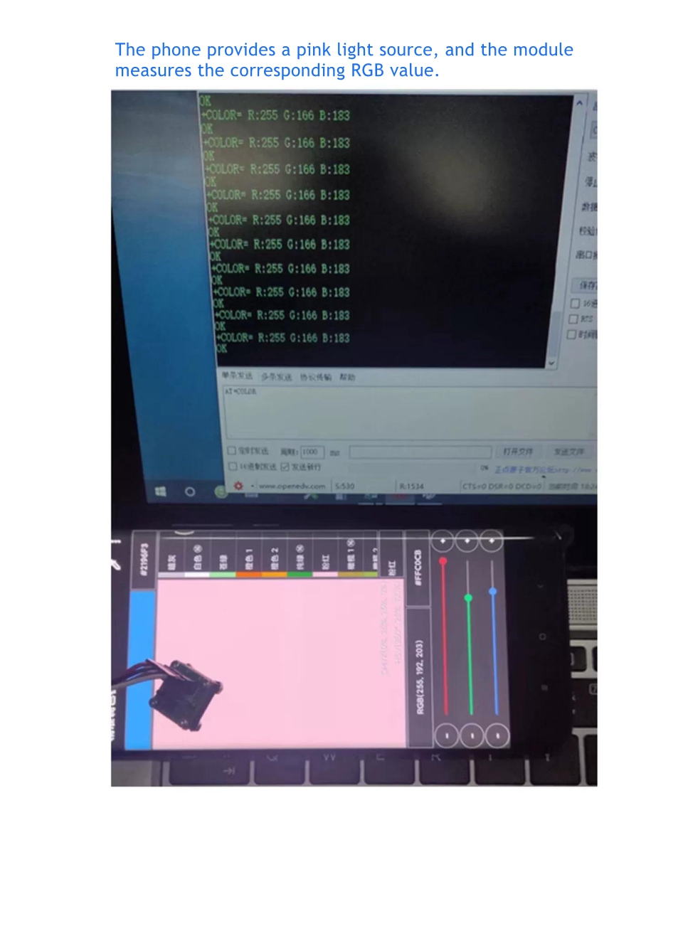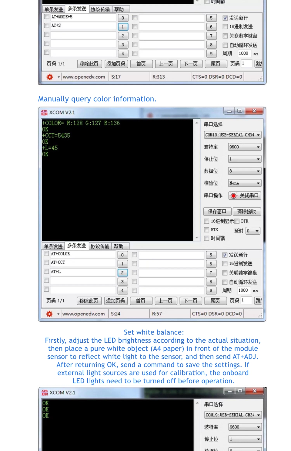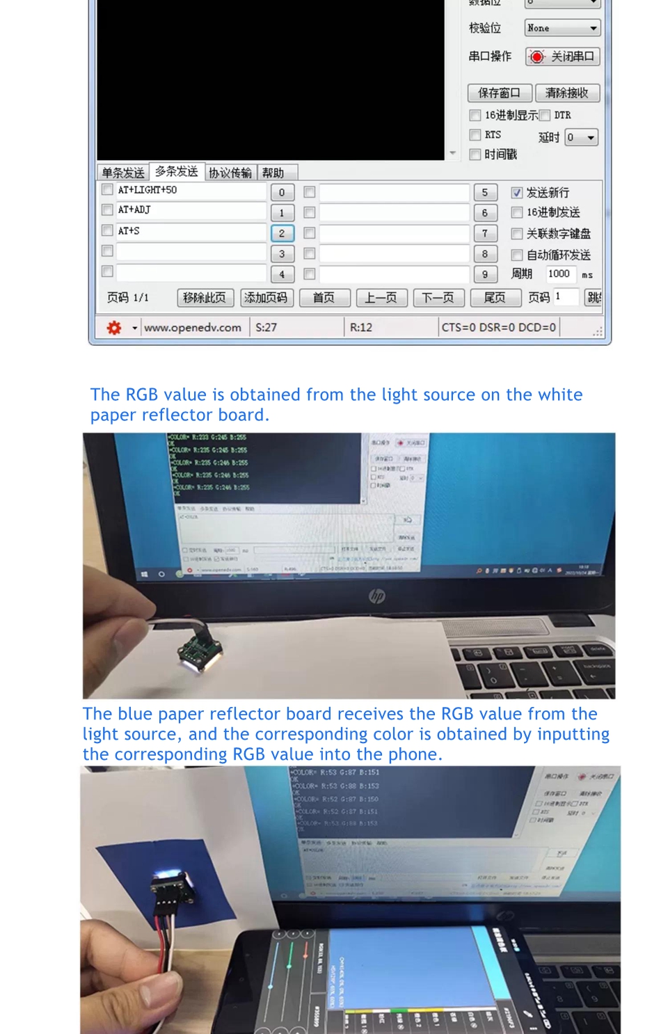 Send the command to turn on the LED on the module board, place white paper above the sensor to reflect white light to the sensor, then send the command "AT+ADJ". After returning OK, the calibration is completed, and finally send the command "AT+S" to save the parameters.