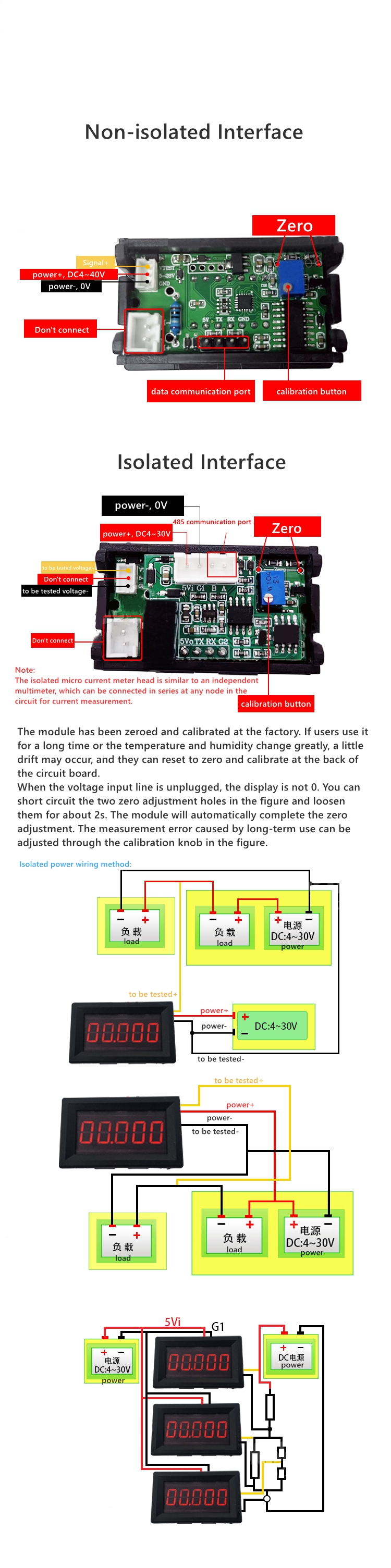 - If the input overload voltage is high and the input voltage reaches 150V, the circuit will not be damaged. When the voltage recovers to plus or minus 100V, the module will immediately measure the voltage normally without restarting.