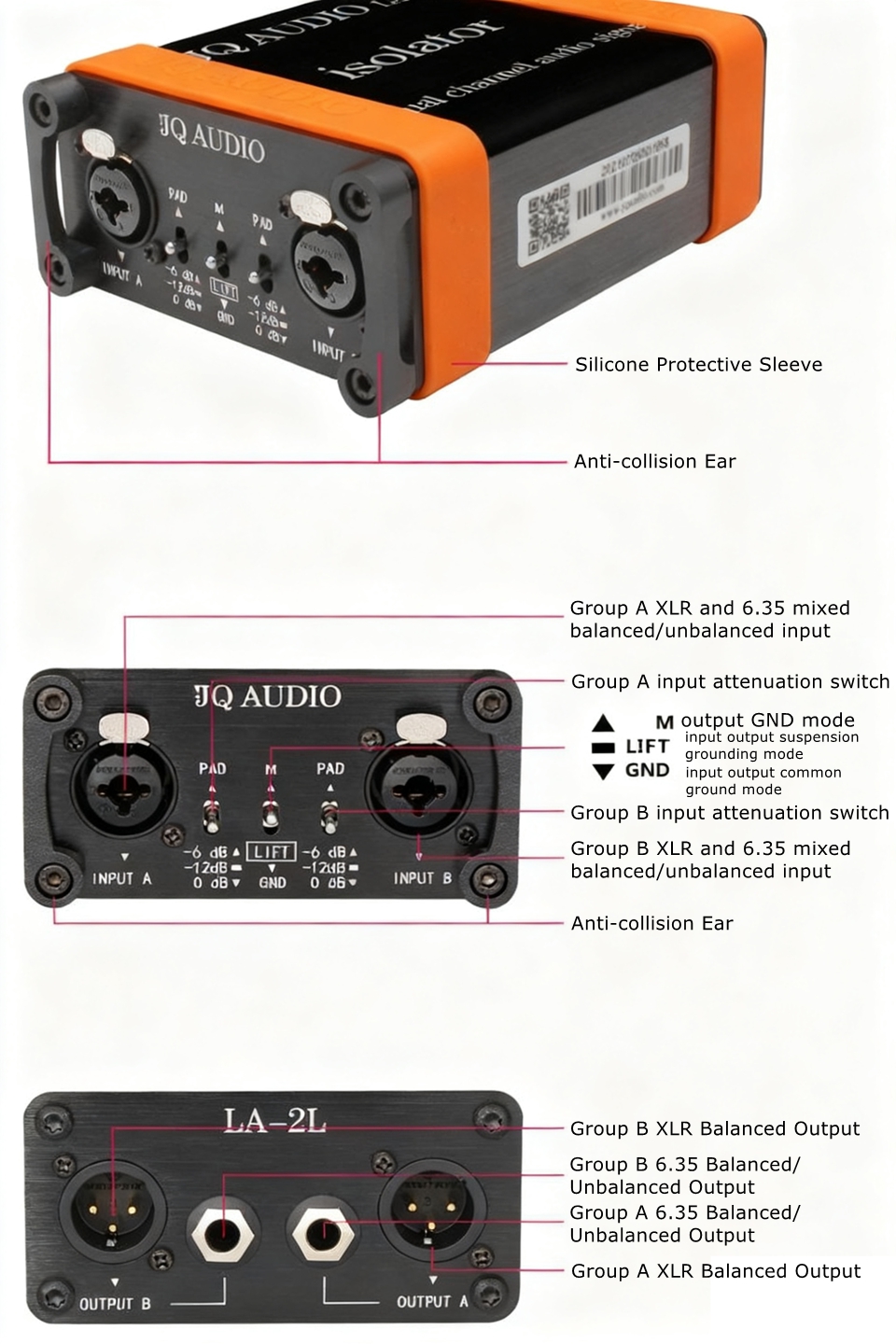 - The upgraded LA-2L audio isolator adopts a custom-made permalloy material audio transformer from an imported manufacturer as the signal coupling and conversion between input and output. The imported connector for NEURIK and double-layer shielded gold-plated circuit design enable signal isolation and conversion between input and output. The input adopts a mixed interface of 6.35 and XLR, and the output adopts an independent interface of 6.35 and XLR, which can be converted between balanced and unbalanced. There are suspension and grounding switches, as well as input signal attenuation switches for Group A and Group B. The input high-level signal can be attenuated, converted, and isolated to completely isolate the potential difference between the two systems, avoiding AC sound interference caused by grounding issues and preventing damage to the input components of the equipment due to excessive potential difference. Realize secure transmission of audio signals.