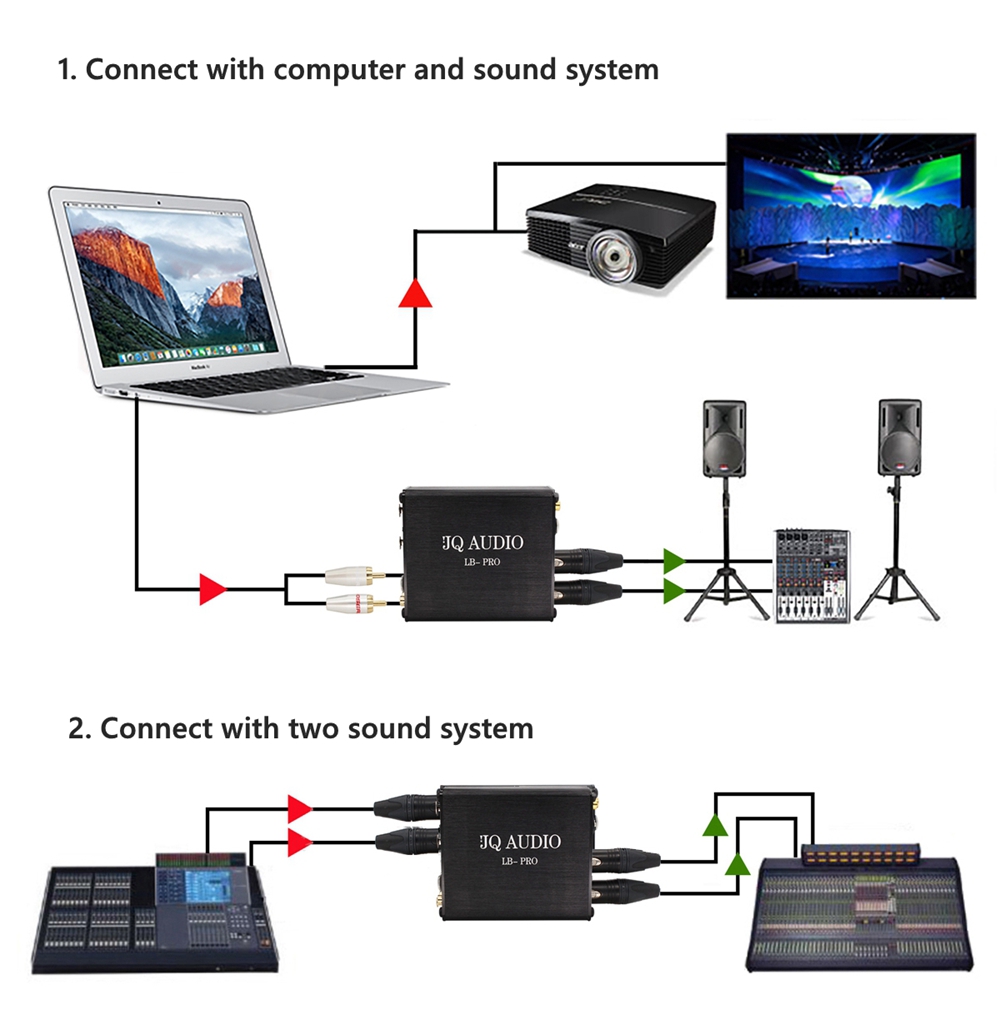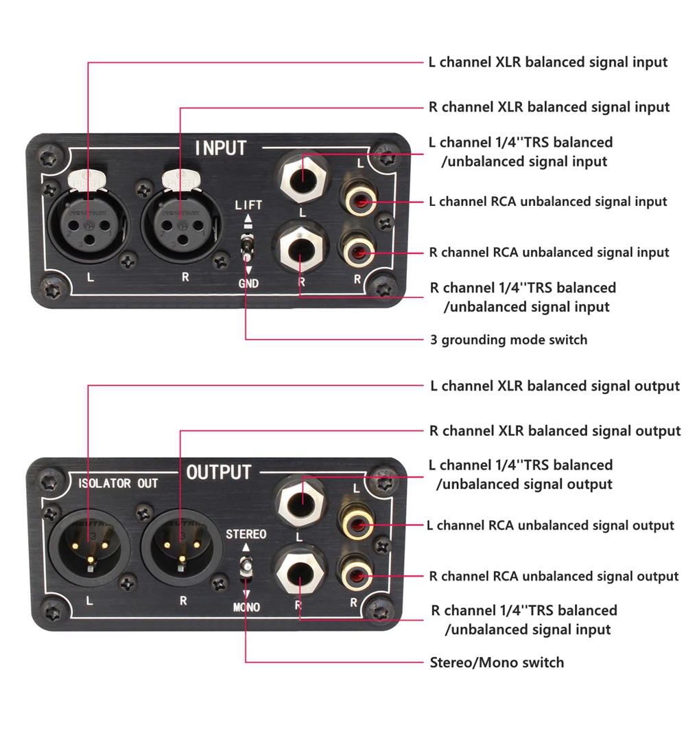 - The upgraded LB-PRO multifunctional audio isolator uses a specially designed permalloy material audio transformer as the signal coupling conversion between input and output, and imported gold plated connectors for NEUTRIK. The double-layer shielded gold-plated circuit design isolates and converts signals between input and output, improves sound quality, removes signal spikes, and adds charm. Independent two channel design, rich interfaces, input XLR/TRS/RCA interface, output XLR/TRS/RCA interface. The different interfaces between input and output, balanced and unbalanced, high impedance and low impedance can all be converted to each other. Equipped with a suspension/grounding mode switch and a stereo/mono switch. Thus, it is possible to achieve the functions of two in one out mixing and one in two out distribution. Completely isolate the potential difference between the input and output systems, avoid current and sound problems caused by grounding issues, prevent damage to the input components of the equipment due to excessive potential difference, and achieve safe transmission of audio signals. Remove the electric current sound generated by connecting laptops, cameras, broadcasting consoles, simultaneous interpretation equipment, electronic musical instruments, and other devices to the mixing console (sound system), and noise generated by impedance mismatch between devices. It is also suitable for theaters, large outdoor performances, lightning protection, sound engineering, multimedia conferences, home HIFI speakers, entertainment venues, exhibitions, etc. It is an important equipment for cascading audio systems.