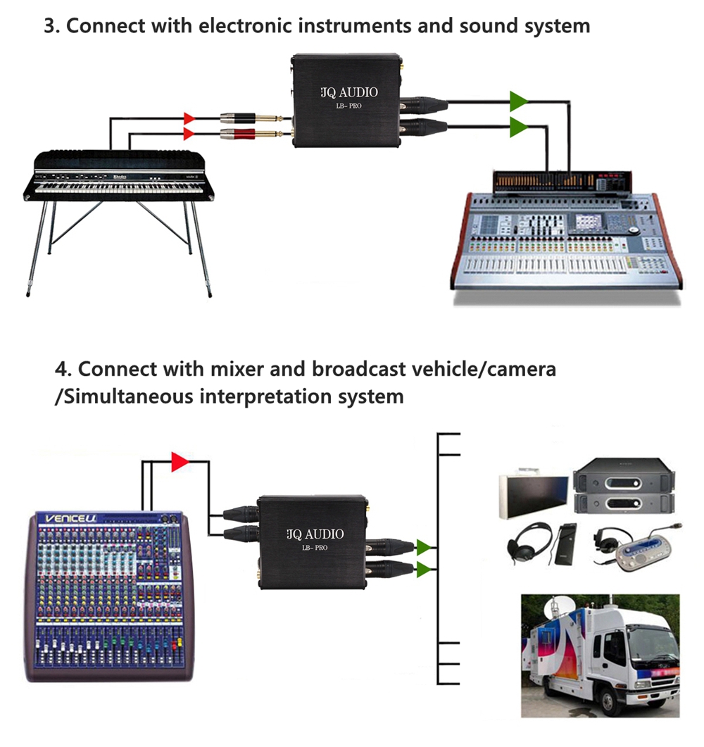 - Eliminate noise generated by the connection between electronic instruments and mixing consoles.