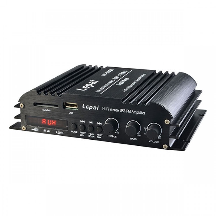 - Lepy's LP-269FS is an all-in-one mini amplifier that features an FM tuner, on-board MP3 decoder with SD/MMC and USB input, stereo RCA audio in with pass-- through stereo RCA audio out, an IR remote control, as well as power output for four speakers.