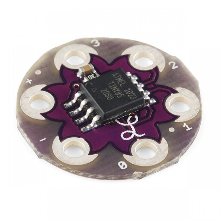 - The LilyTiny is a tiny little LilyPad board designed to add flashy functionality to your project without taking up a lot of room. Even though it's as small as some of the LilyPad sensors, this board actually has an ATtiny microcontroller on it so it's actually pretty smart! Simply sew on 4 LEDs and connect a battery and the LEDs will each blink or fade differently. One will blink on and off (2), another will flash a heartbeat pattern (1), another will do a "breathing" fade (0) and the other will do a random fade (3). LilyTiny is a quick and easy way to add twinkling lights to a project without any programming or a bulky Main Board. It's also a great educational tool for showing a range of functionality without having to get out the computers.- If you're an advanced user and want to re-program the LilyTiny, the ICSP programming connectors are broken out on the back.