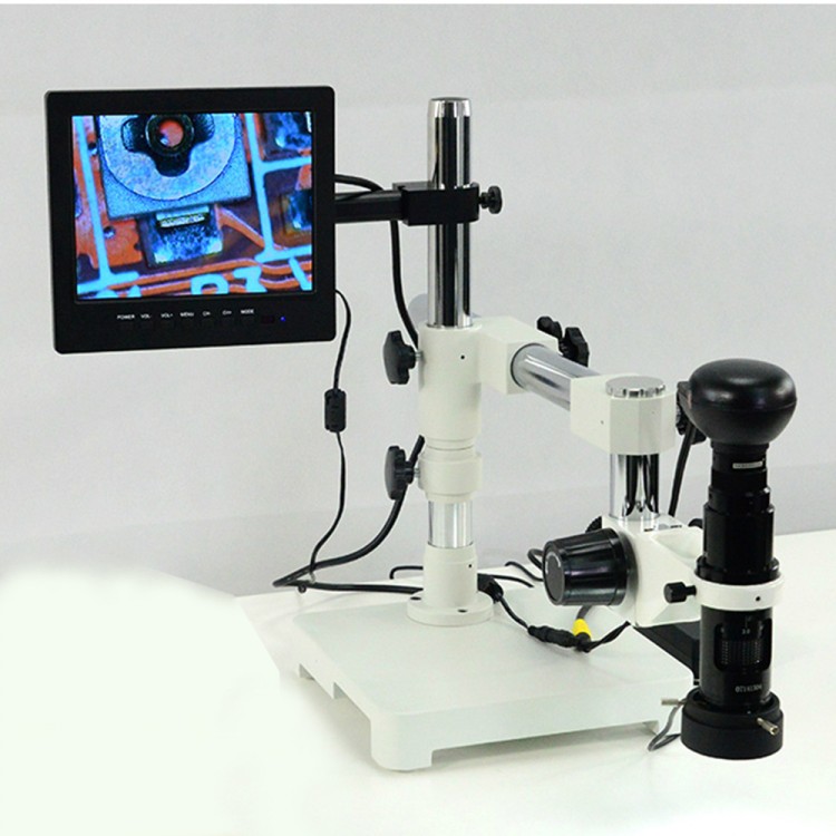 Long Arm Microscope/video microscope, 360 degree rotational for optics department and can arbitrarily adjust the optical department, but also shortening and lengthening the optical observation arm length in order to change jobs, it can rotate 360 display screen observation angle and buy 0.5x auxiliary lens with optical, working distance (165mm), to meet to the needs of the various inspection.
