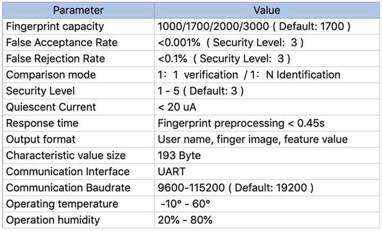 Uart protocol, Compact size and ultra-low power consumption makes it very attractive to use around M5Stack series product. it performs fast fingerprint matching with highest security level and optimal user convenience. You can program to set the fingerprint recognition comparison level and different security level . if you ever consider secure your project with biometrics,don’t forget to include this M5unit FINGER.