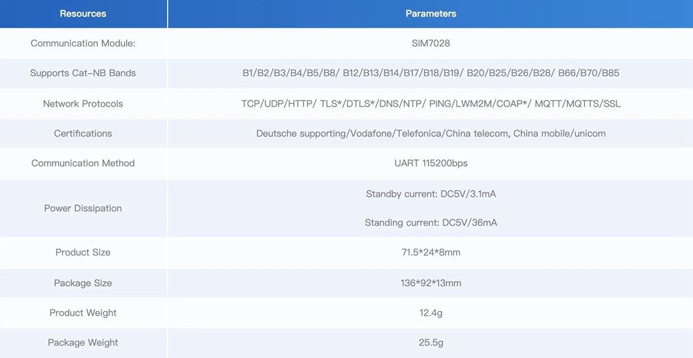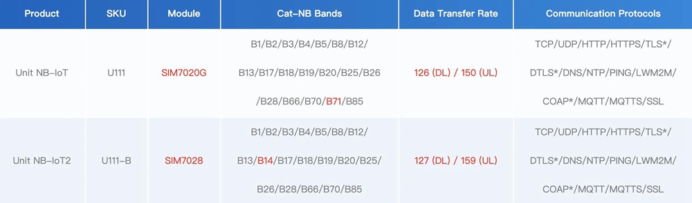 - Cat-NB frequency bands: B1/B2/B3/B4/B5/B8/B12/B13/B14/B17/B18/B19/B20/B25/B26/B28/B66/B70/B85