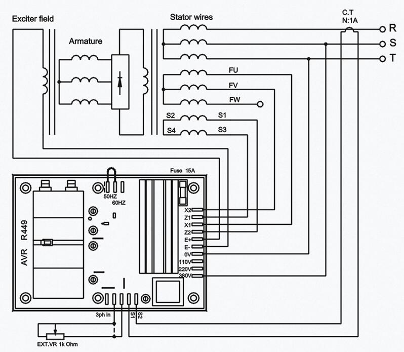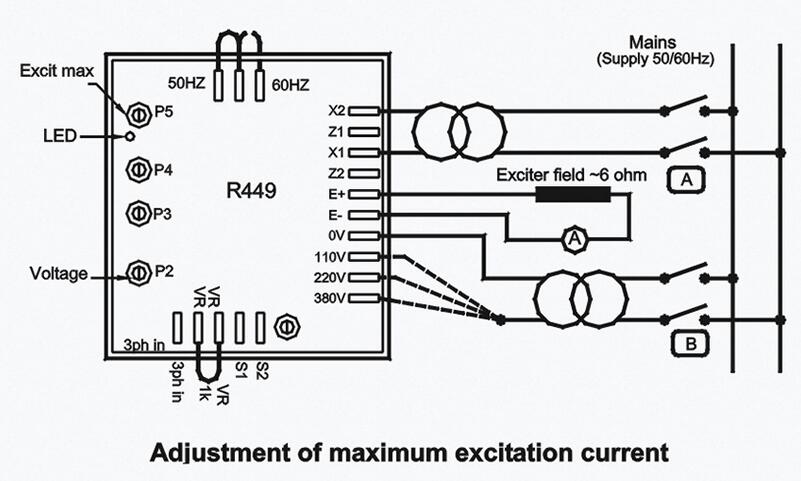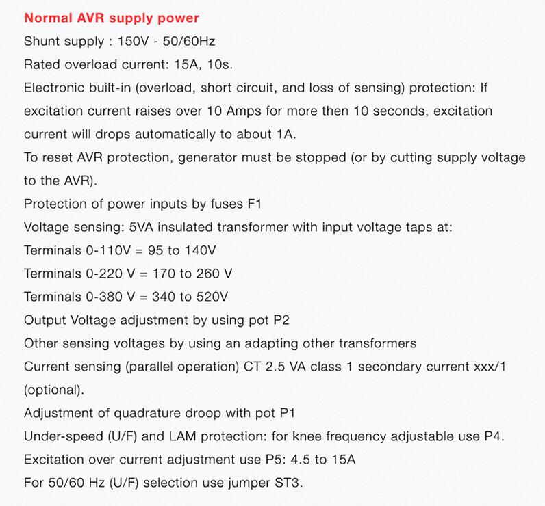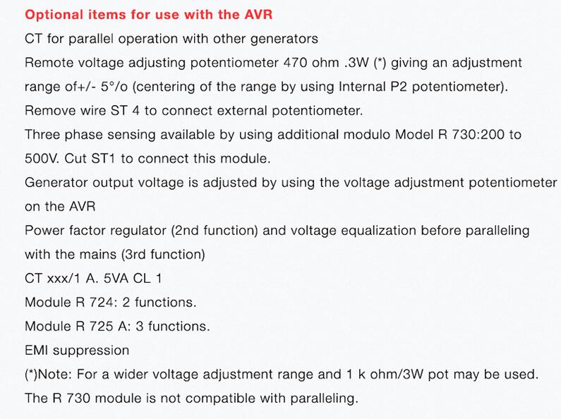 Diesel generator parts AVR voltage regulator R449 is a half-wave phase controlled thyristor type automatic voltage regulator and forms part of the excitation system for a brushless generator. In addition to regulating the generator voltage, the AVR circuitry includes under speed and sensing loss protection to ensure safe, reliable control of the generator. Positive voltage build up from residual levels is ensured by the use of proficient semiconductors in the power circuitry of the AVR. Which is linked with the main stator windings and the exciter field windings to offer closed loop control of the output voltage with load regulations of +/-1.5%.