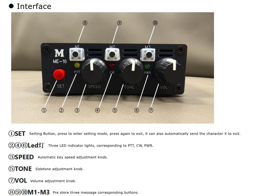 - Press the SET key on the Keyer panel, and when you hear the "da" prompt sound, enter the configuration mode where you can use the auto key to send relevant letters for configuration. If the letters sent are not very standard and Keyer cannot recognize them, Keyer will reply with a "?" (Morse code question mark) query, and relevant commands can be sent again at this time.