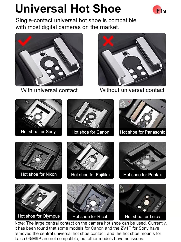 * Single-contact universal hot shoe is compatible with most digital cameras on the market.