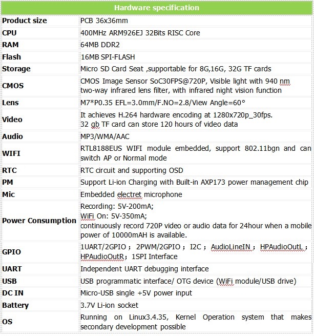 The BPI-D1 is the smallest open-source development board around, with a built-in HD mini camera. At 36mm (w) x36mm (l) and weighing in at 10g, it’s much smaller and lighter than any mini-cam or camera board out there. It allows you to create and customize your own mini-cam and can be a valuable part of any cool hardware you are working on. The D1 prides itself on providing high-resolution image quality: Both video and photos are collected at 1280x720p with a video acquisition rate of 30 fps.