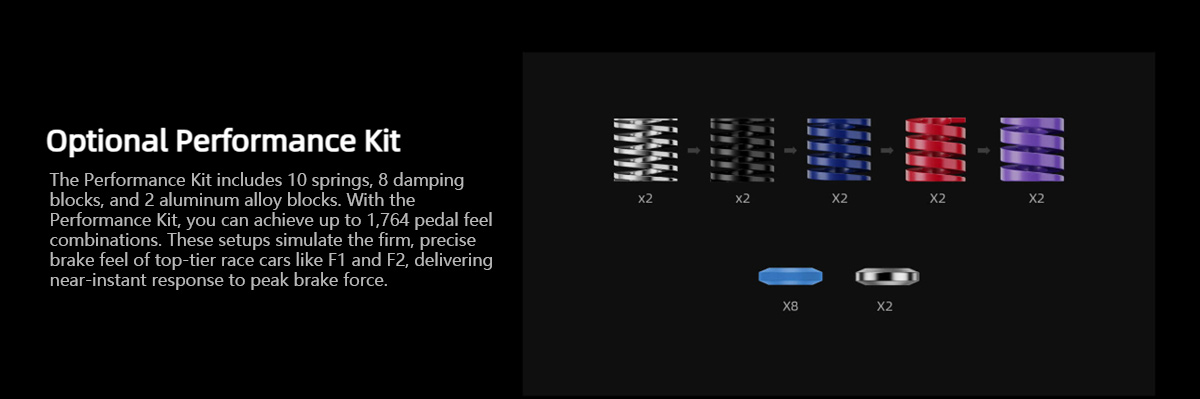 The Performance Kit for the CRP2 allows you to fully customize the braking feel of your pedals, simulating the hard brake response of top-tier race cars like F1 and F2. Featuring 10 springs, 8 damping blocks, and 2 aluminum alloy blocks, this kit offers 1,764 possible configurations, enabling you to fine-tune pedal response and travel to your preference. Whether you prefer a linear braking experience or minimal pedal travel, this kit provides the tools to optimize your performance.