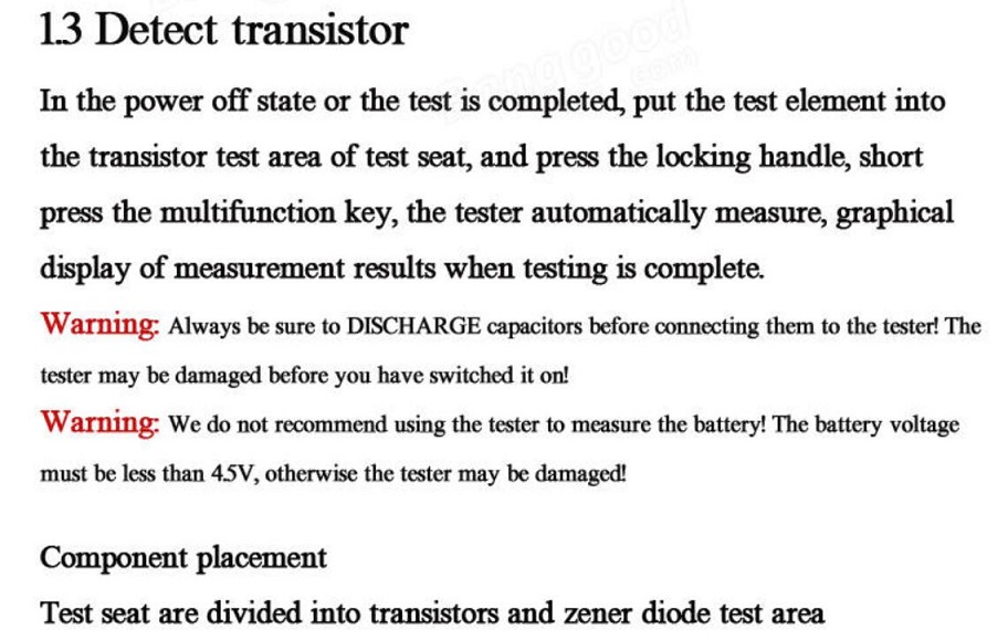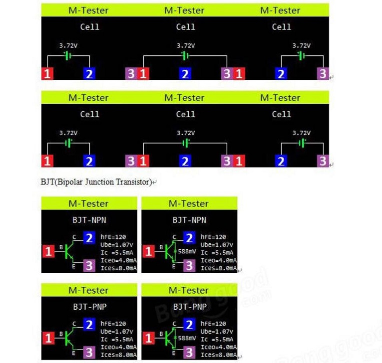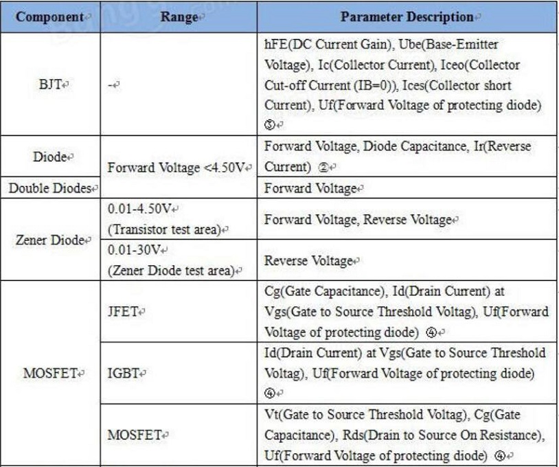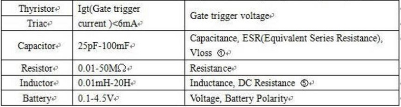 - It can be widely used to detect NPN and PNP transistor,capacitor,resistor,diode,triode,N-channel and P-channel MOSFET,IGBT,JFET, triac and battery etc.
