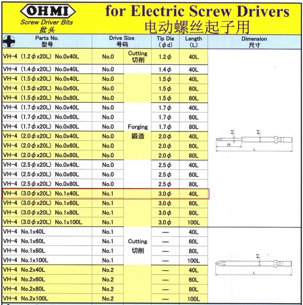 OHMI VH-4 3.0mm Screwdriver Screw Driver Bits SIZE No. x 40L 10pcs