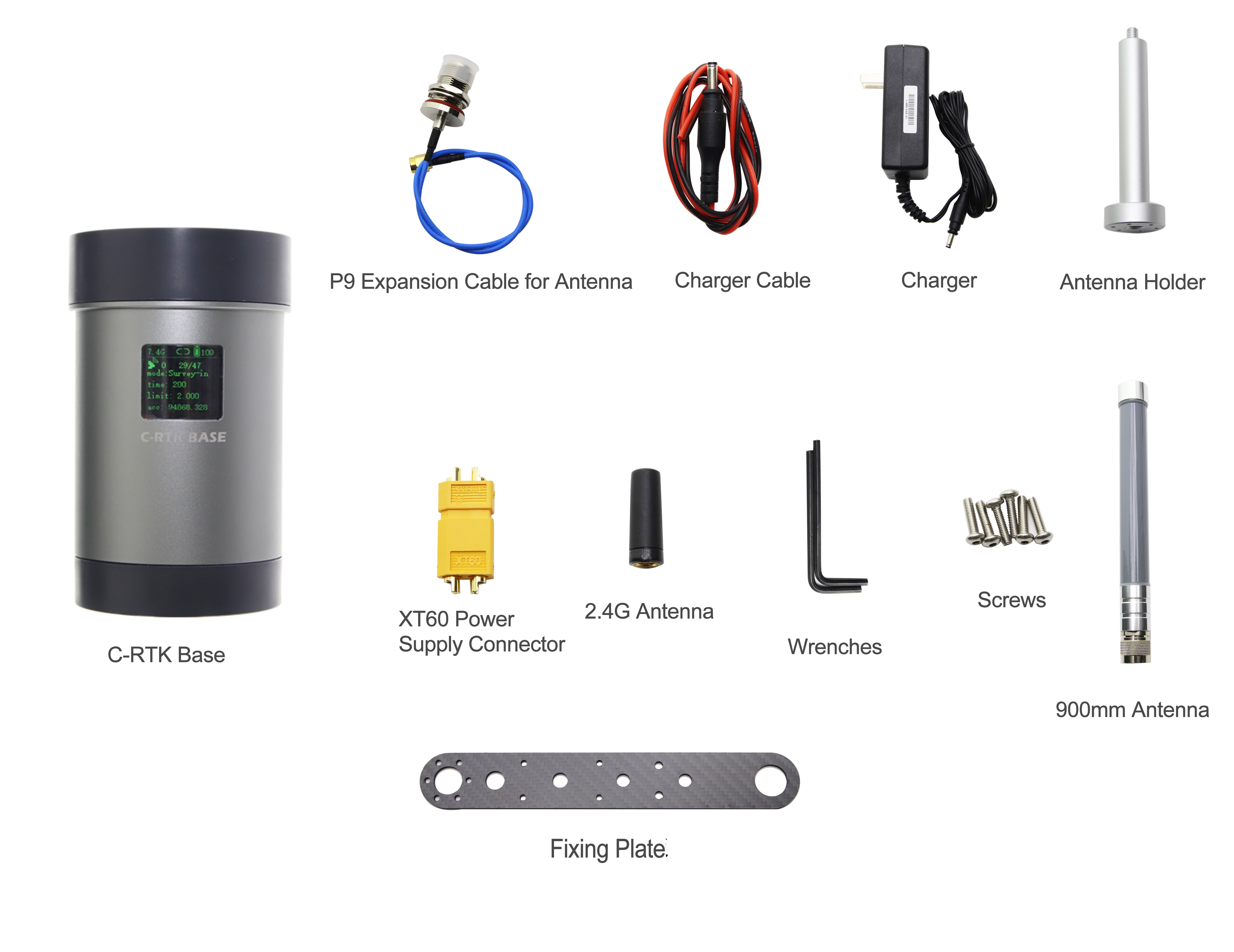 RTK-BASE will receive the RTK raw data and transmit it to the drones in the same group through the built-in digital transmission for receiving, and the drone receiving the data is not limited by the number. The built-in P9 digital transmission can reach up to 30KM, and the built-in RTK module has a baseline length of up to 10KM.