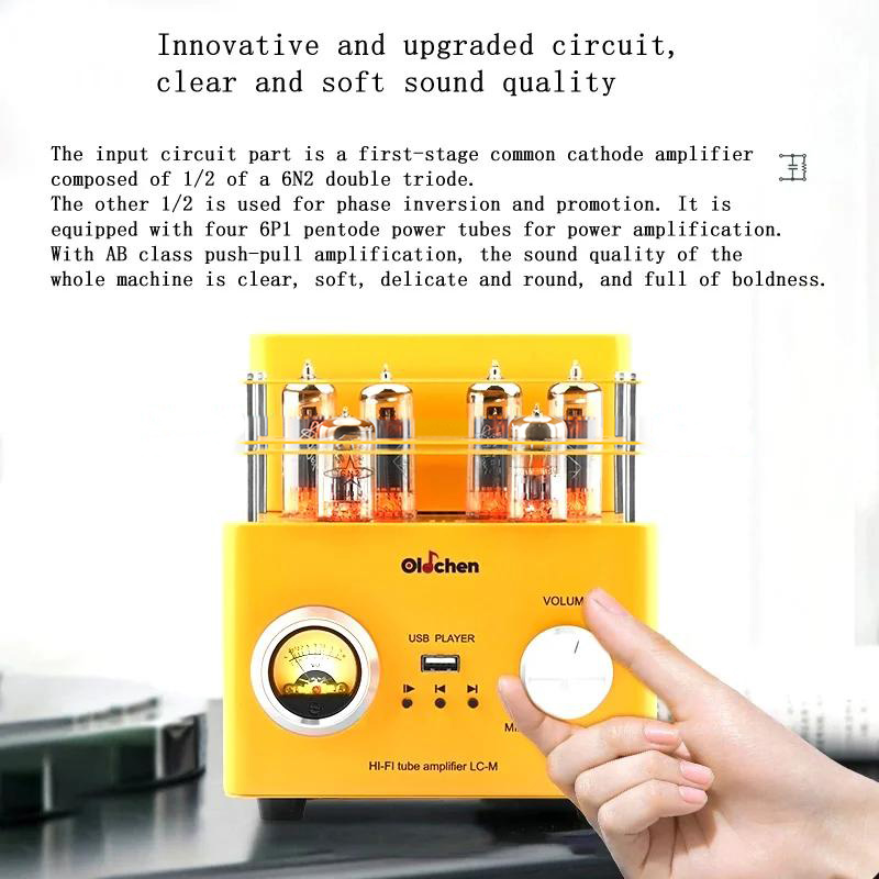 - The 6P1 electronic tube amplifier has extraordinary charm. The box is treated with high gloss paint technology, which is smooth and shiny. It is eye-catching and pleasing to the eye when placed at home; VU meter with aluminum alloy meter head ring, exquisite craftsmanship, elegant style; Pure copper gold-plated output terminals have strong texture and durability.