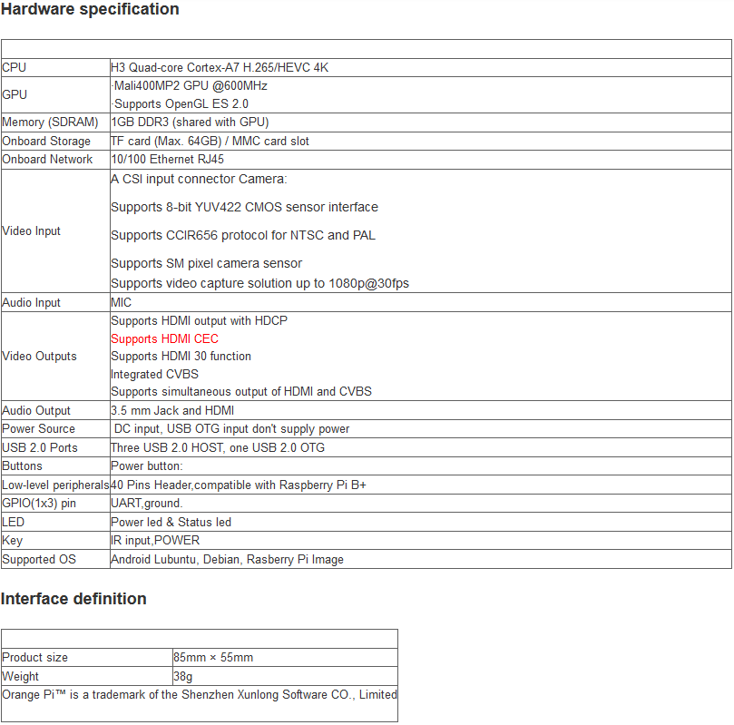 It uses the AllWinner H3 SoC, and has 1GB DDR3 SDRAM