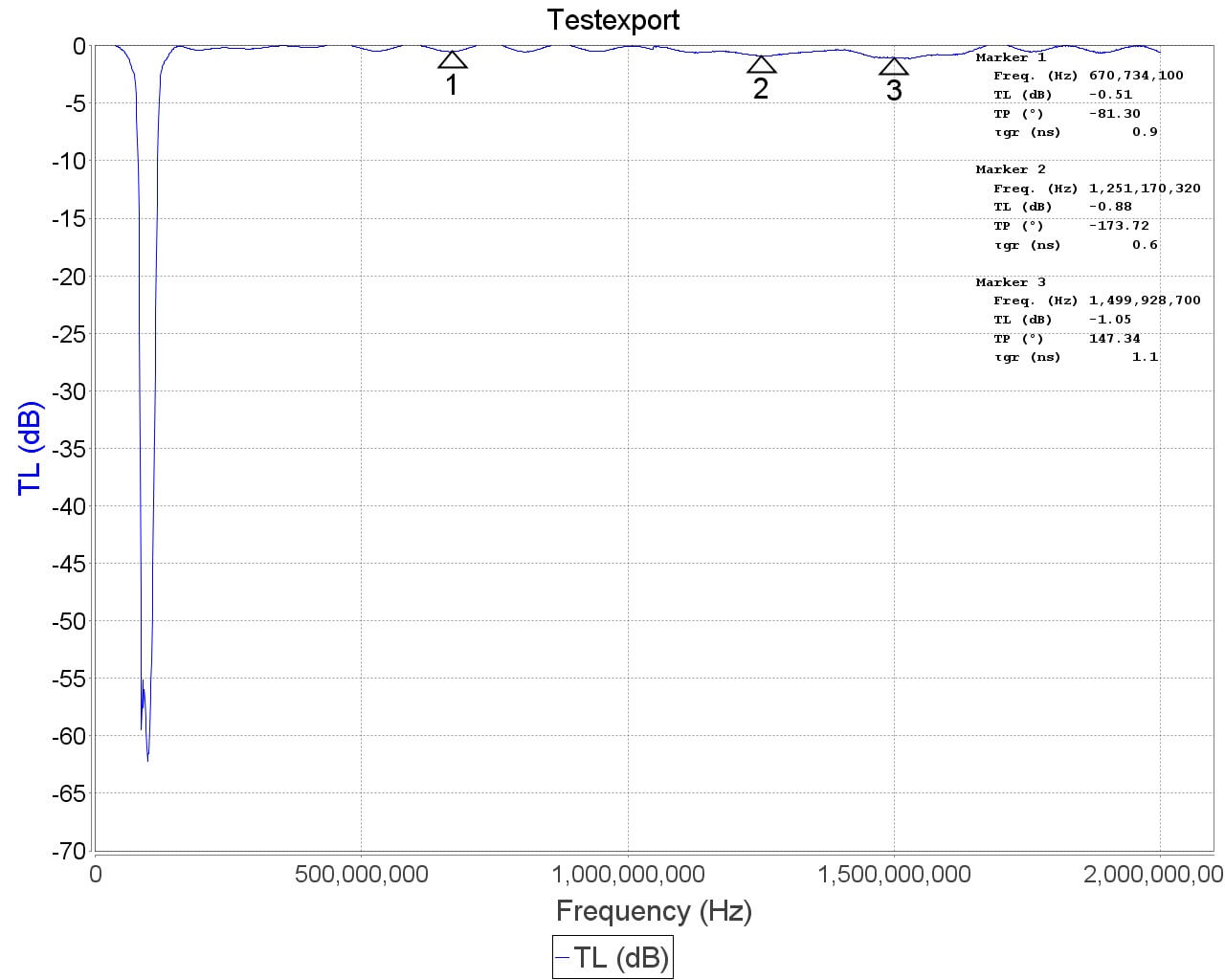 The filter is based on a simple 7th order Chebyshev design. The 3 dB roll off is at 76 MHz and 122 MHz. 88 MHz is attenuated by almost 60 dB, and 108 MHz is attenuated by 45-50 dB. Outside of the pass band the insertion loss is practically zero below 500 MHz, less than 0.5 dB from 500 MHz – 1 GHz, and below 1.5 dB between 1 GHz – 2 GHz. Between 2 – 3 GHz performance degrades slightly, but insertion loss remains below 1.5 dB for most frequencies. The filter can also pass up to 80 mA of DC current (probably can do more) and has negligible DC resistance.
