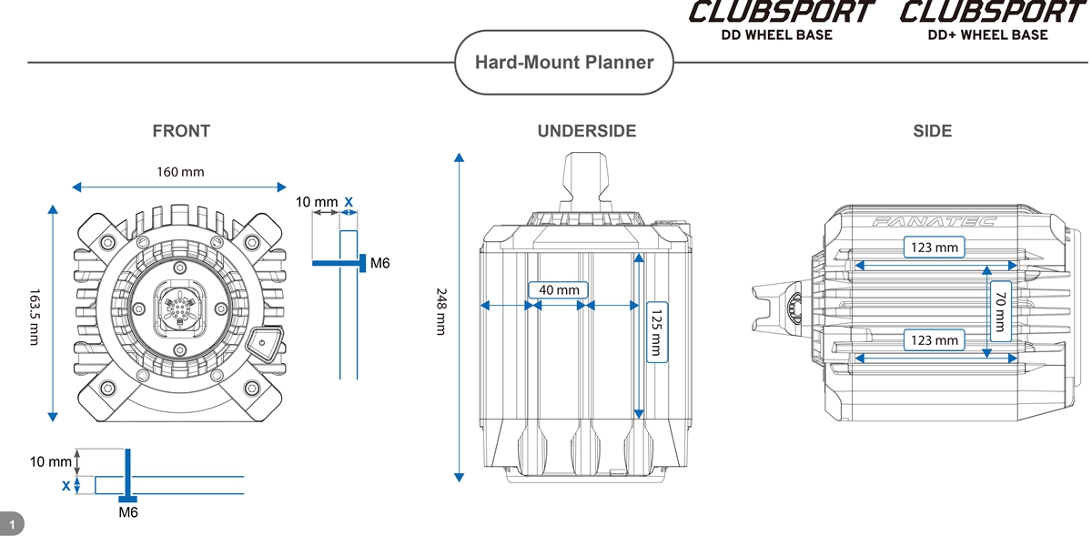 * Front-mounted threaded inserts for future Fanatec accessories. Not intended for front-mounting the wheel base to a sim racing chassis/cockpit.