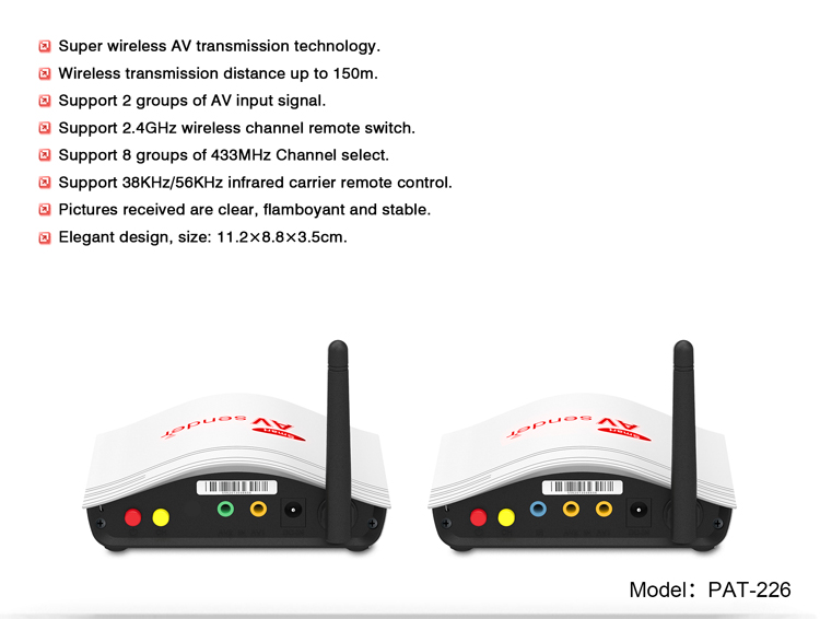 PAT-226 as “The Smart Digital STB Wireless Sharing Device” is a kind of innovative product, which can realize the audio video signal sharing in different rooms for family entertainment. It consists of a transmitter and a receiver. Adopting advanced 2.4GHz wireless transmission schemes and having advantages of long distance transmission, strong anti-interference and high mobility. Moreover, it can support 2.4GHz wireless channel remote switch, AV signal switch, IR remote control at receiver end. By means of radio waves, it can transmit the signal from DVD player, DVR, CCTV camera, IPTV, Satellite receiver, Digital TV Set Top Box or any other A/V devices at transmitter end to TV sets in different room at receiver end. So that you can enjoy freely wireless HD AV sharing data and Hi-Fi audio and video effect.
